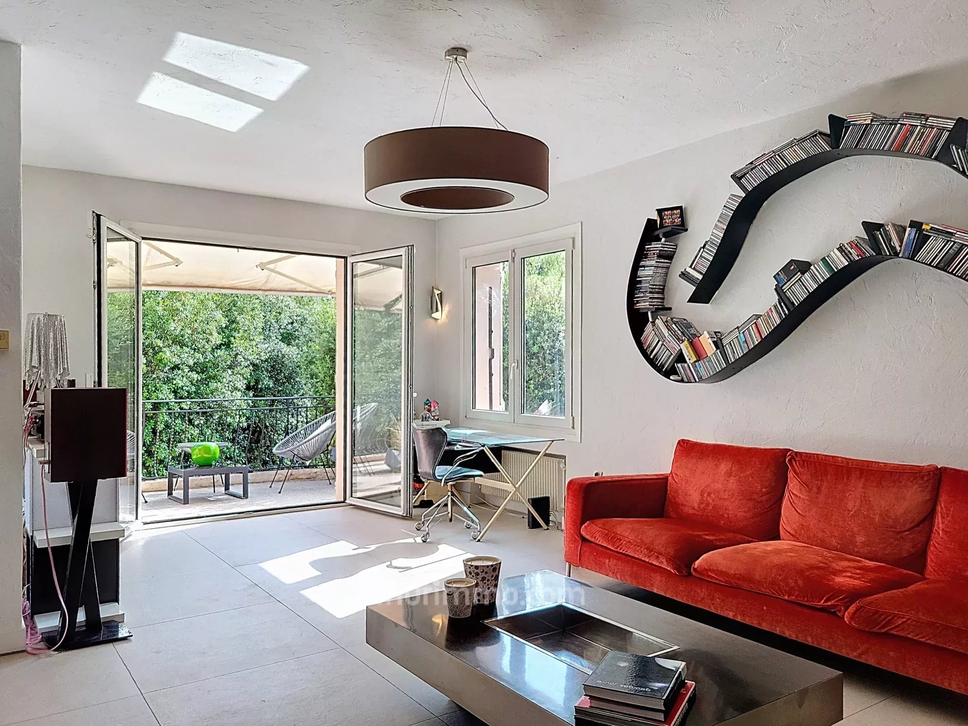 Séjour lumineux offrant une vue sur la nature.