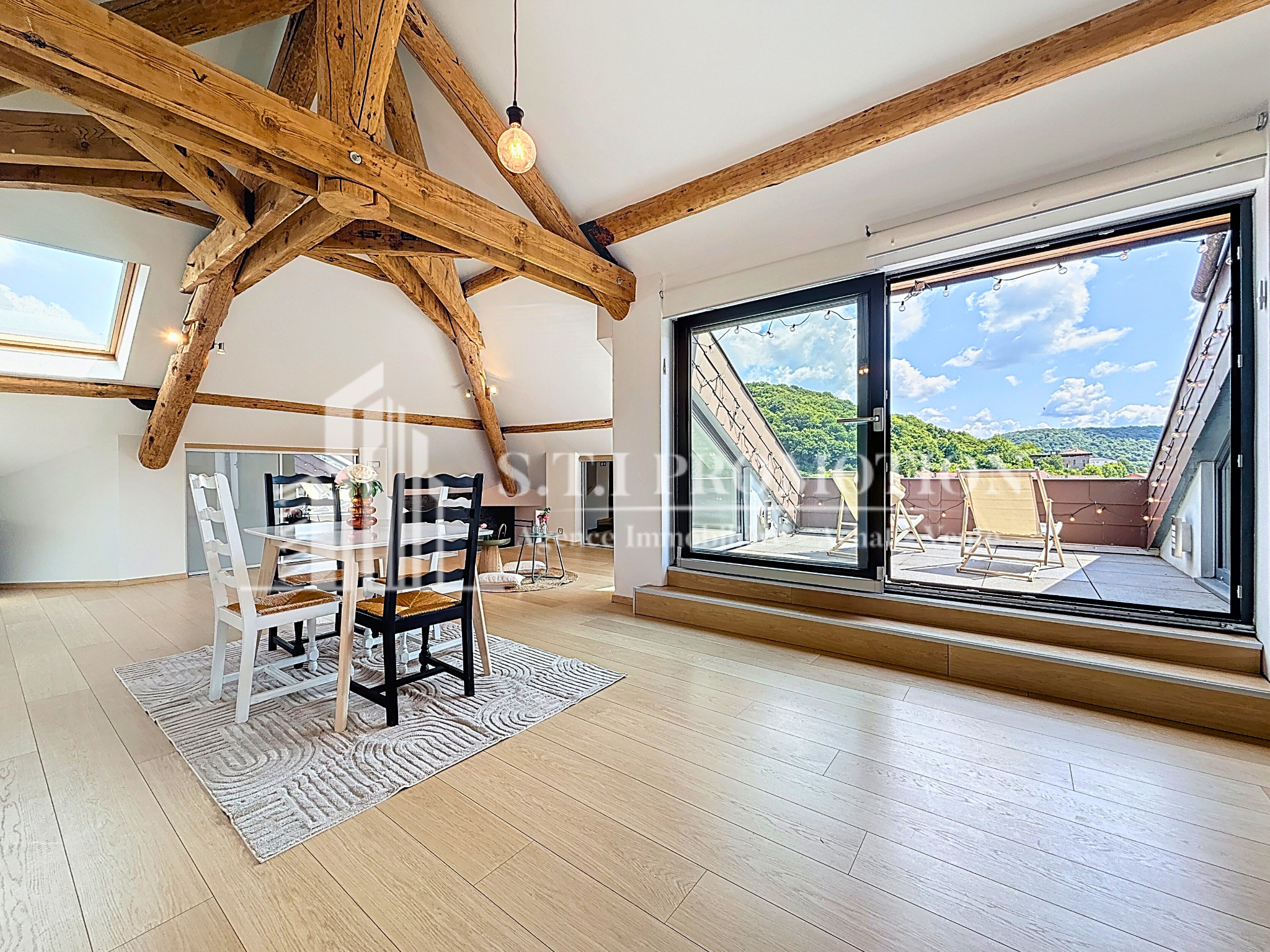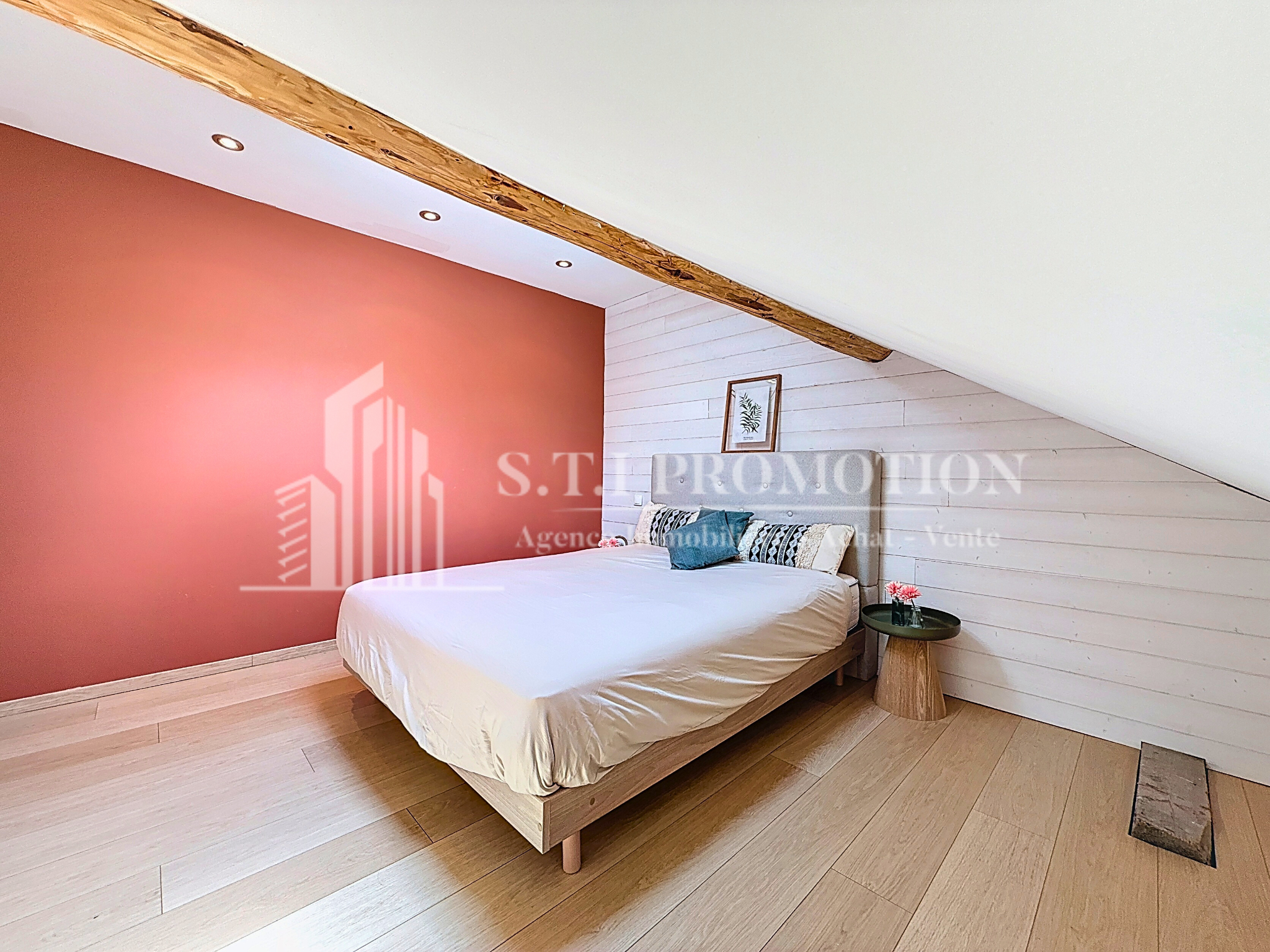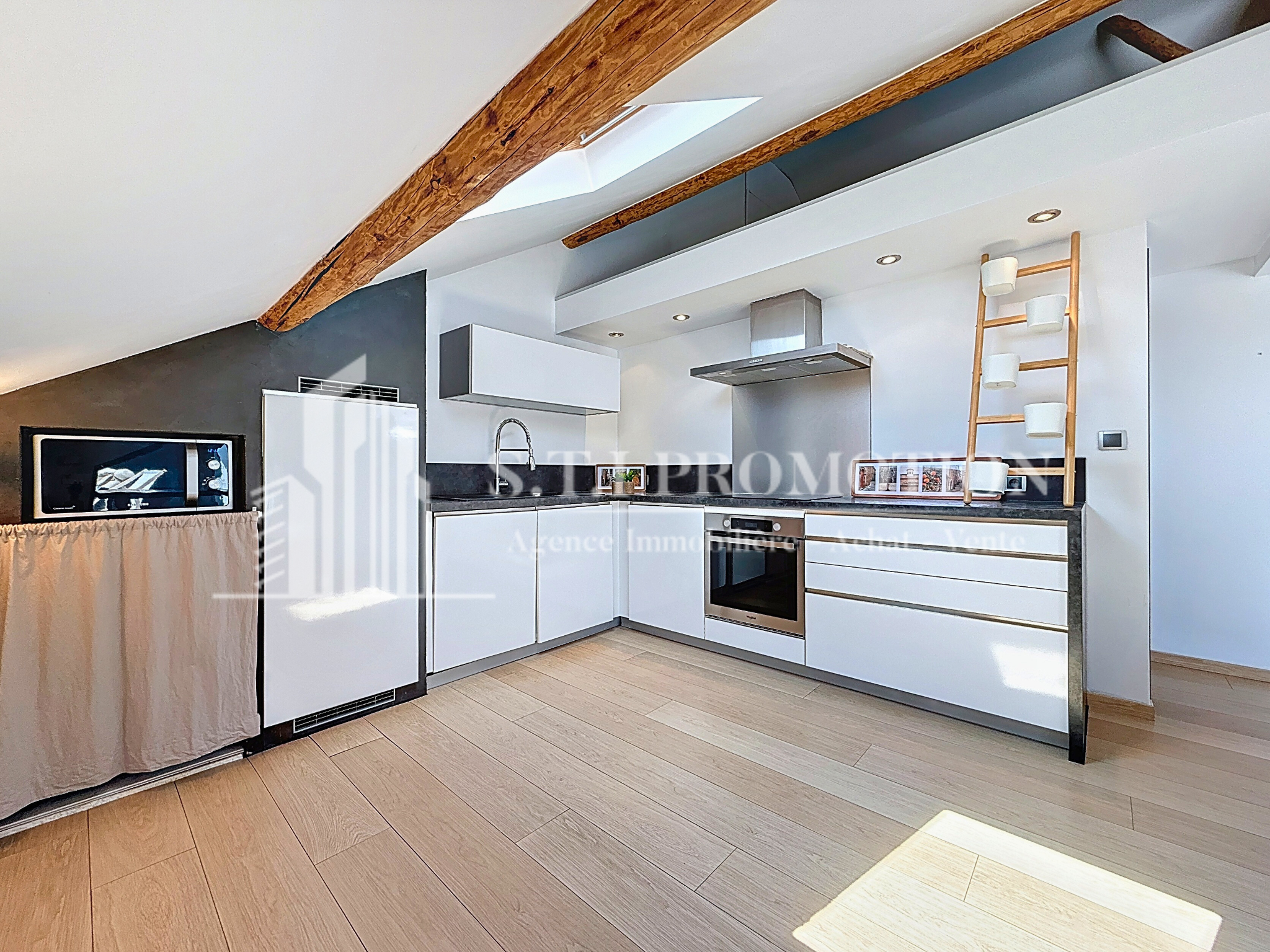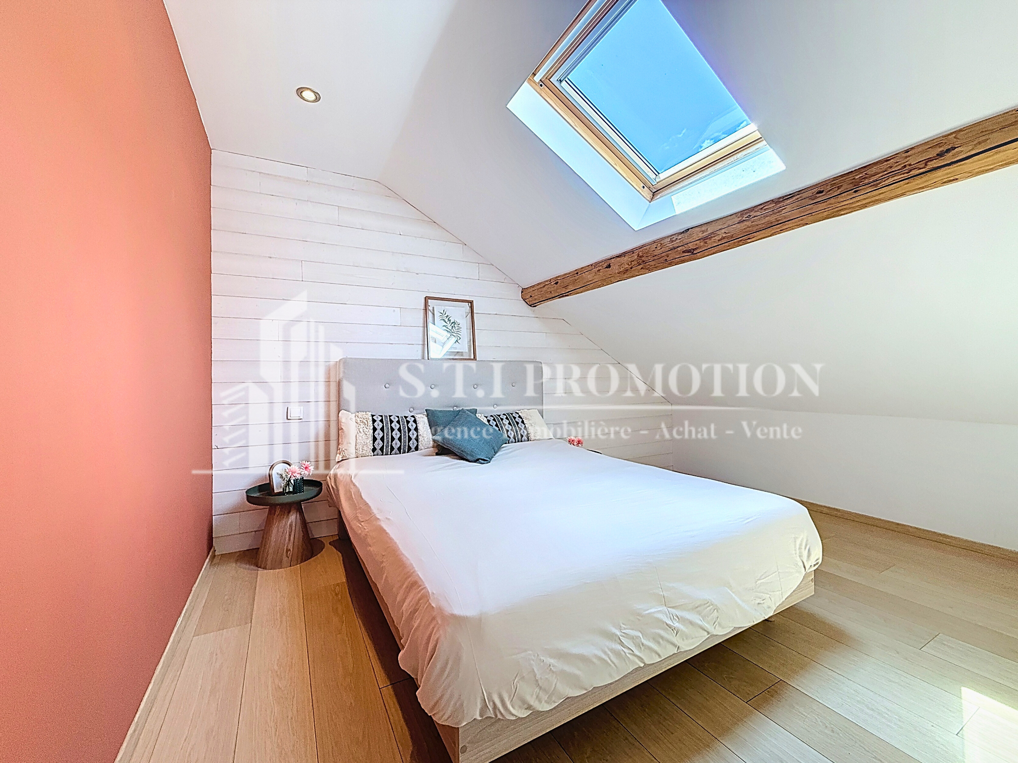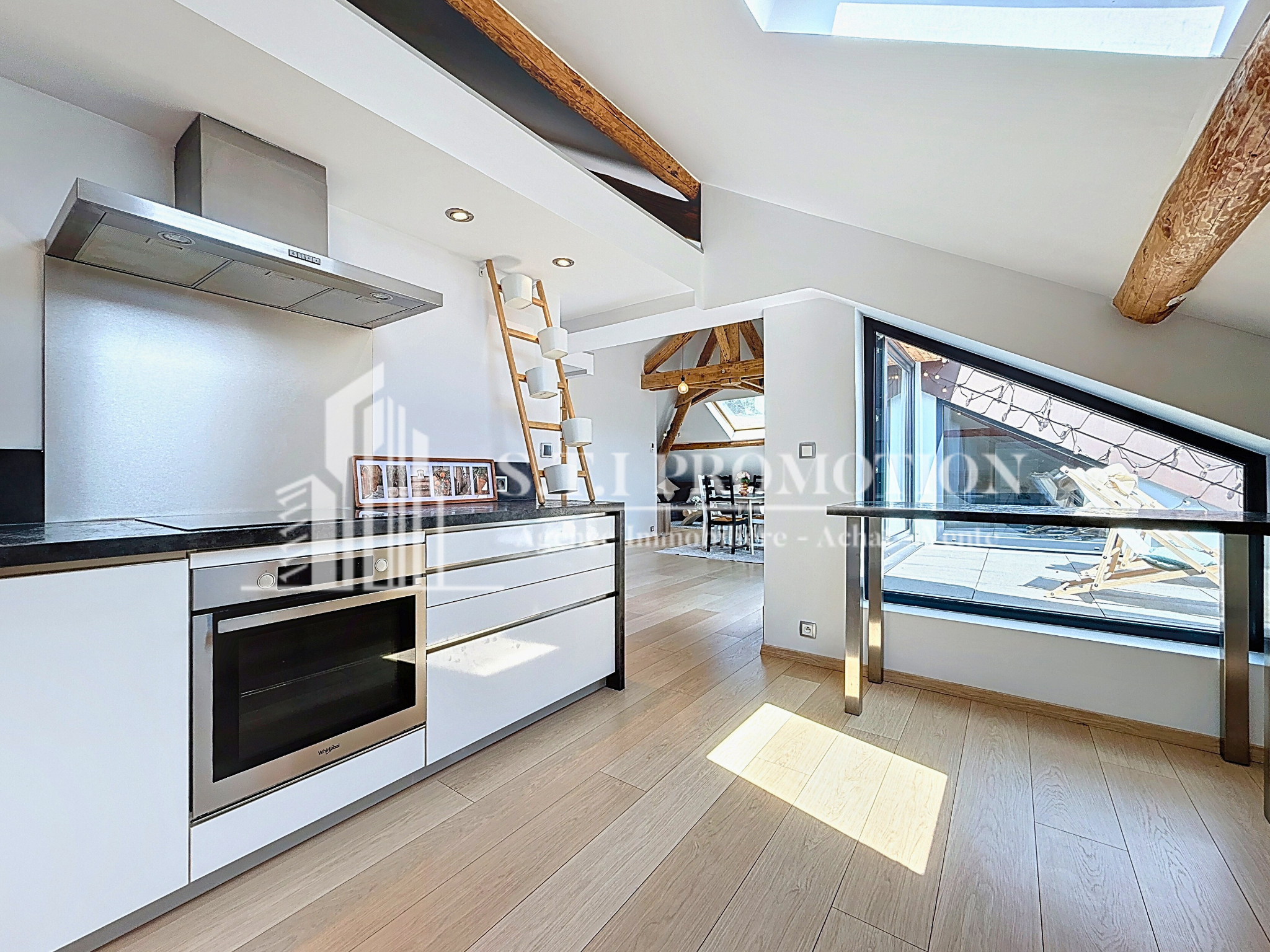 2 chambres, grande pièce de vie avec charpente apparente