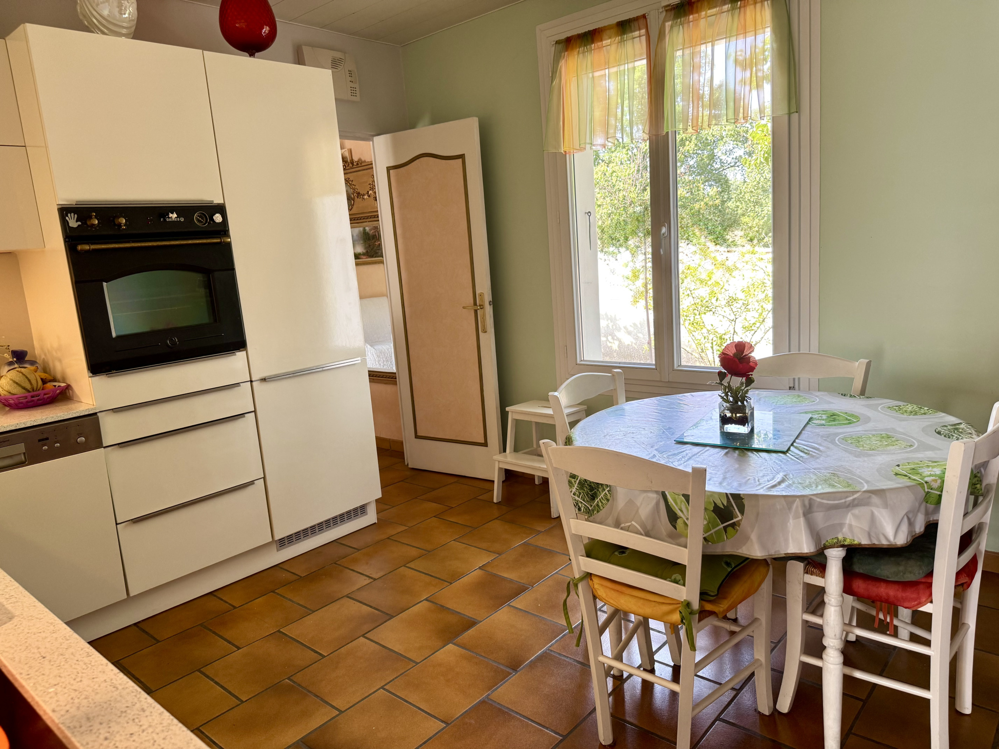 Jolie maison familiale de 136 m2 avec séjour double traversant de 36 m2 ouvrant d'un côté sur le jardin et de l'autre sur la véranda de 24m2, cuisine séparée aménagée et équipée, cellier, 4 belles chambres lumineuses (dont 1 avec salle d'eau), salle de bains communes, 2 WC, et nombreux rangements.