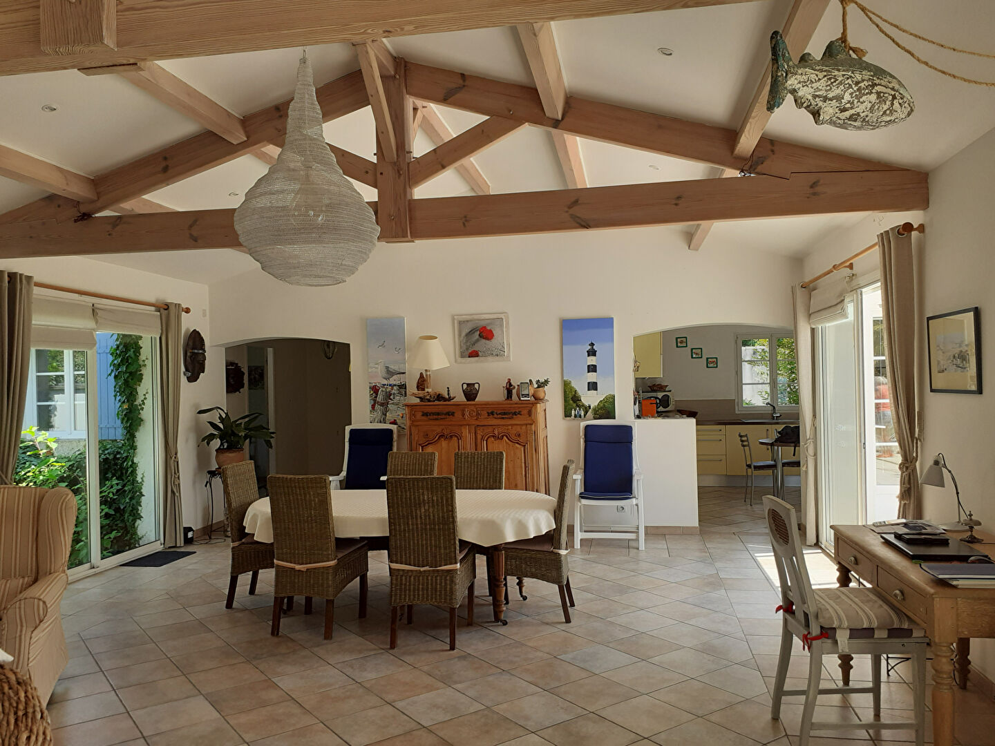 Au calme, dans un environnement naturel (réserve d'oiseaux), à 1,5 km des belles plages, sur un terrain de 865 m² où règne la sérénité, MAISON (1999) d'une surface habitable de 155 m² comprenant un séjour suivi d'une cuisine de 70 m², trois chambres avec placard, un wc, une salle d'eau et une chambre parentale avec salle d'eau et wc - Une buanderie - Chauffage par pompe à chaleur et panneaux solaires - Une piscine avec terrasse et local technique - Une salle à manger sous auvent - Dépendances