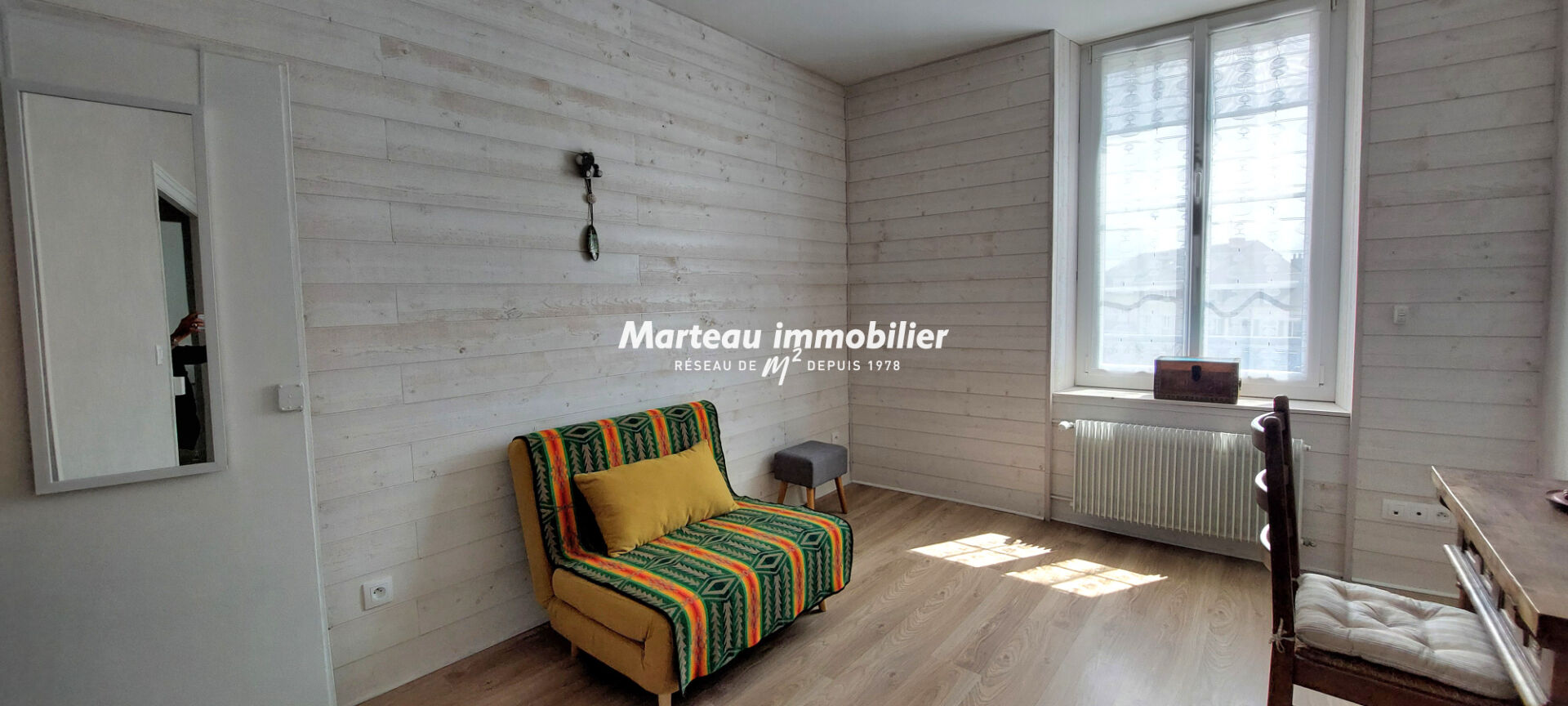 Le premier étage s'ouvre sur un palier desservant une vaste pièce de vie baignée de lumière, ainsi qu'une grande cuisine aménagée et équipée. Un toilette avec lave-mains situé à mi-étage.