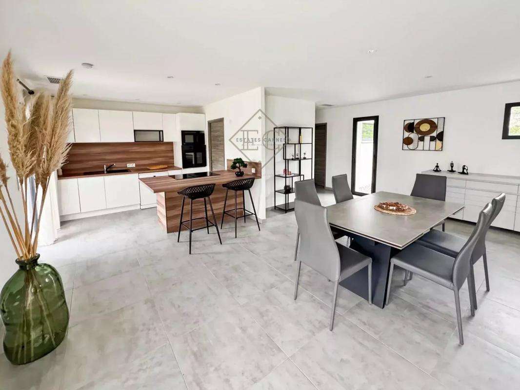 Une cuisine ouverte moderne, adjacente à un séjour baigné de lumière. Un cellier pratique, un WC.