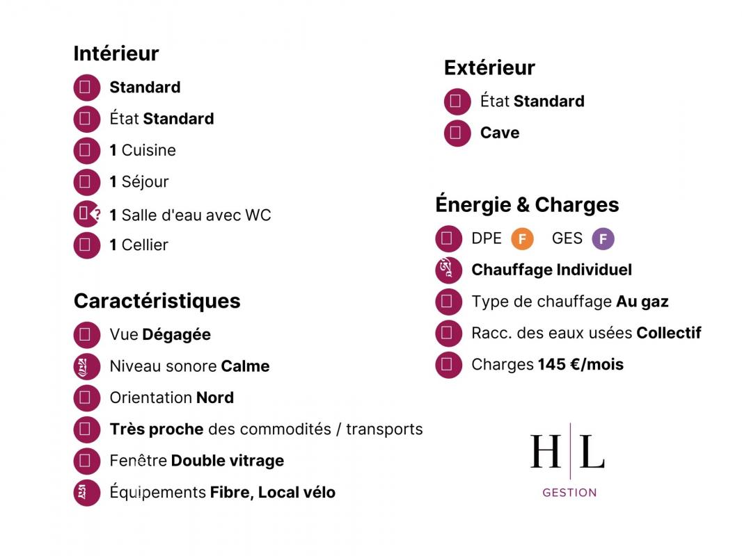 Chauffage individuel au gaz, double vitrage, fibre optique, local vélo, charges mensuelles de 145 €. DPE : classe F.