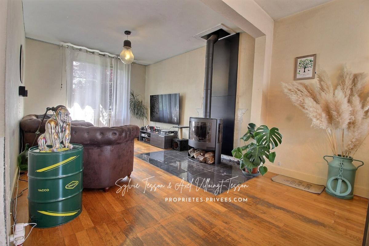 Etage : salon-séjour avec son poêle à bois, cuisine, deux chambres, salle de bains, wc