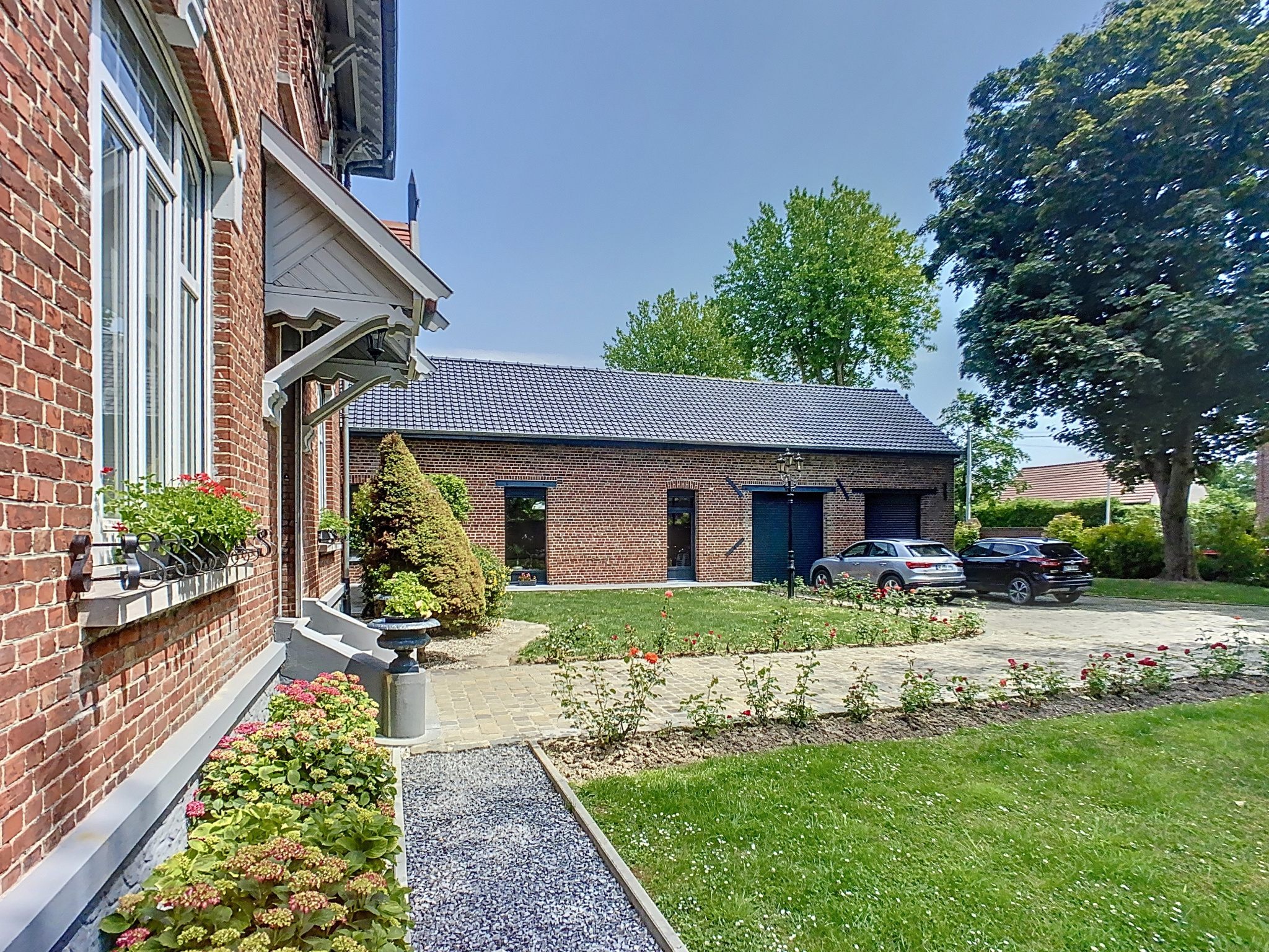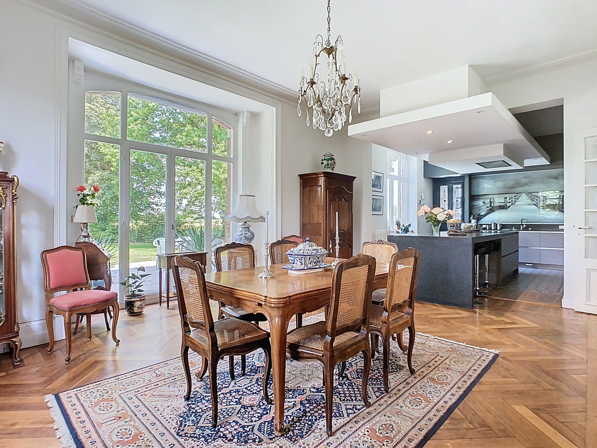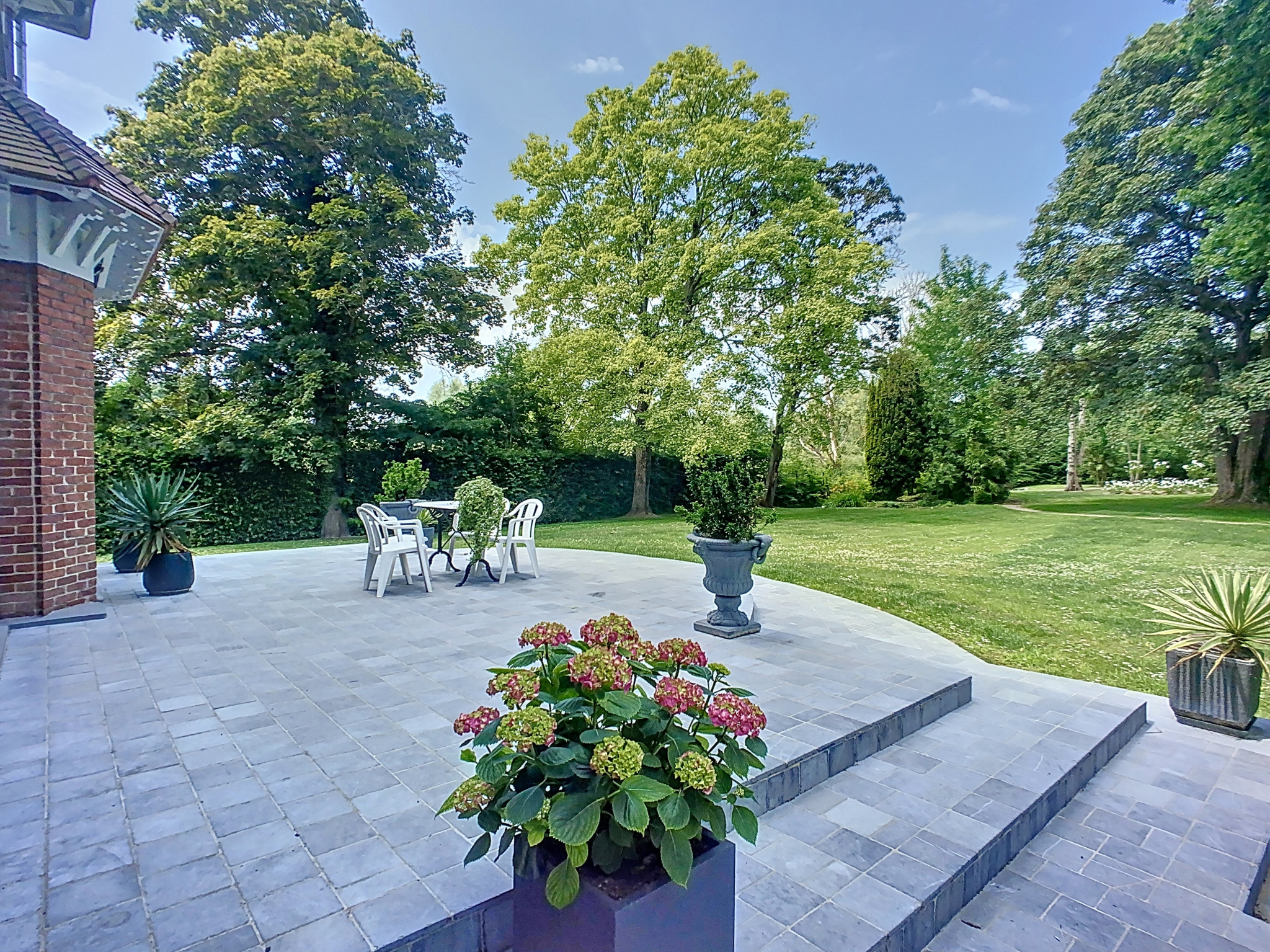 Côté extérieur, une grande terrasse avec vue sur le parc arboré. Une dépendance de 150 m2 habitables comprend une cuisine d'été, une pièce de réception, un double garage et des combles aménageables selon vos projets.