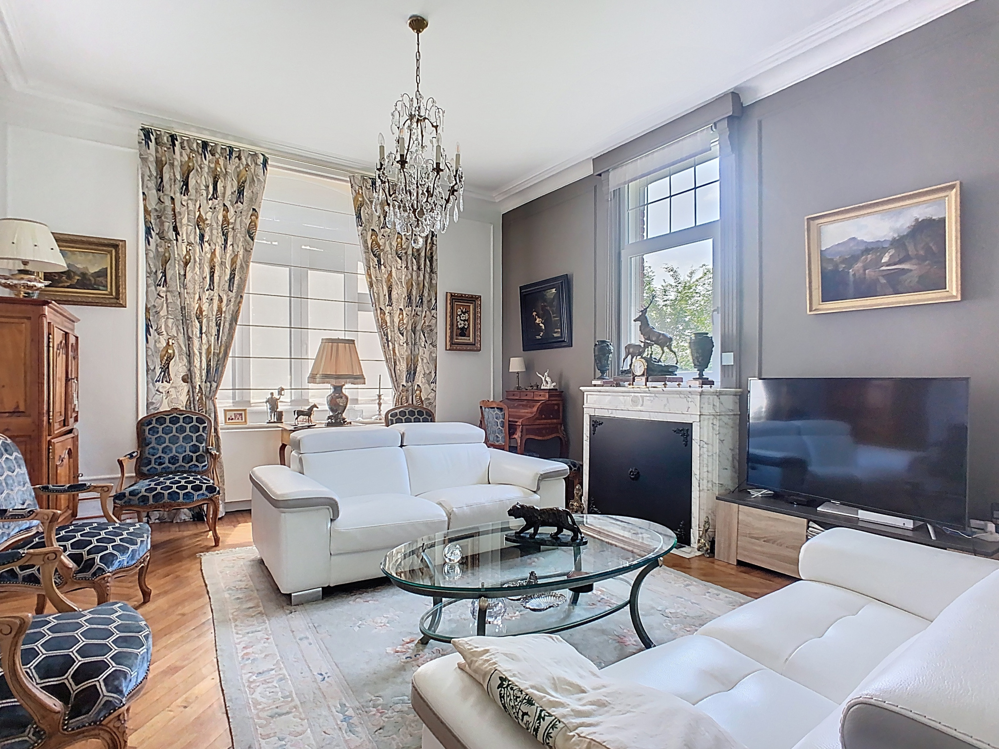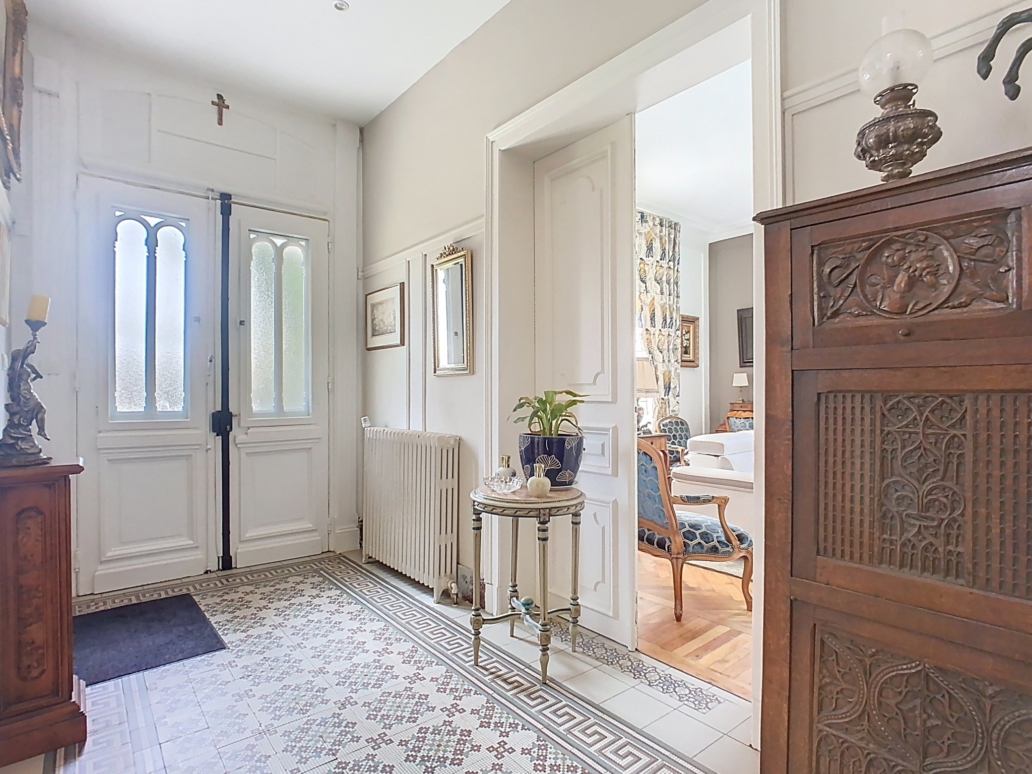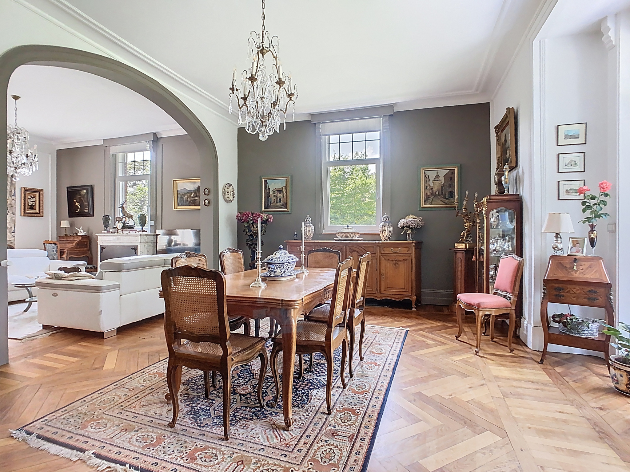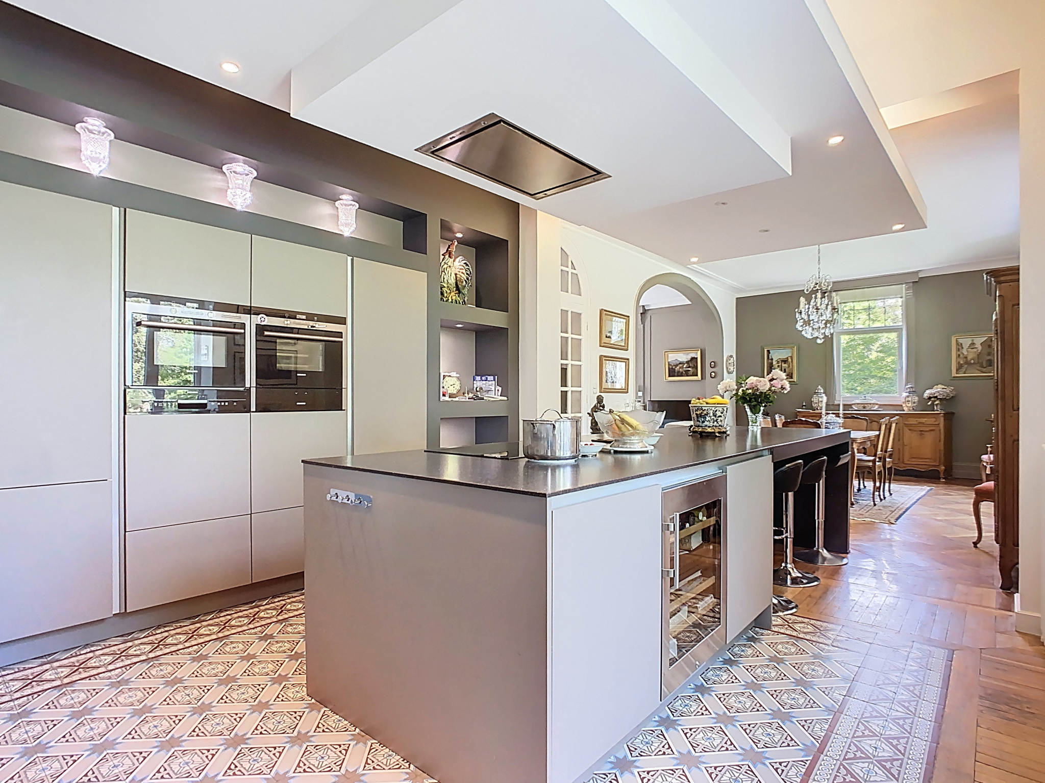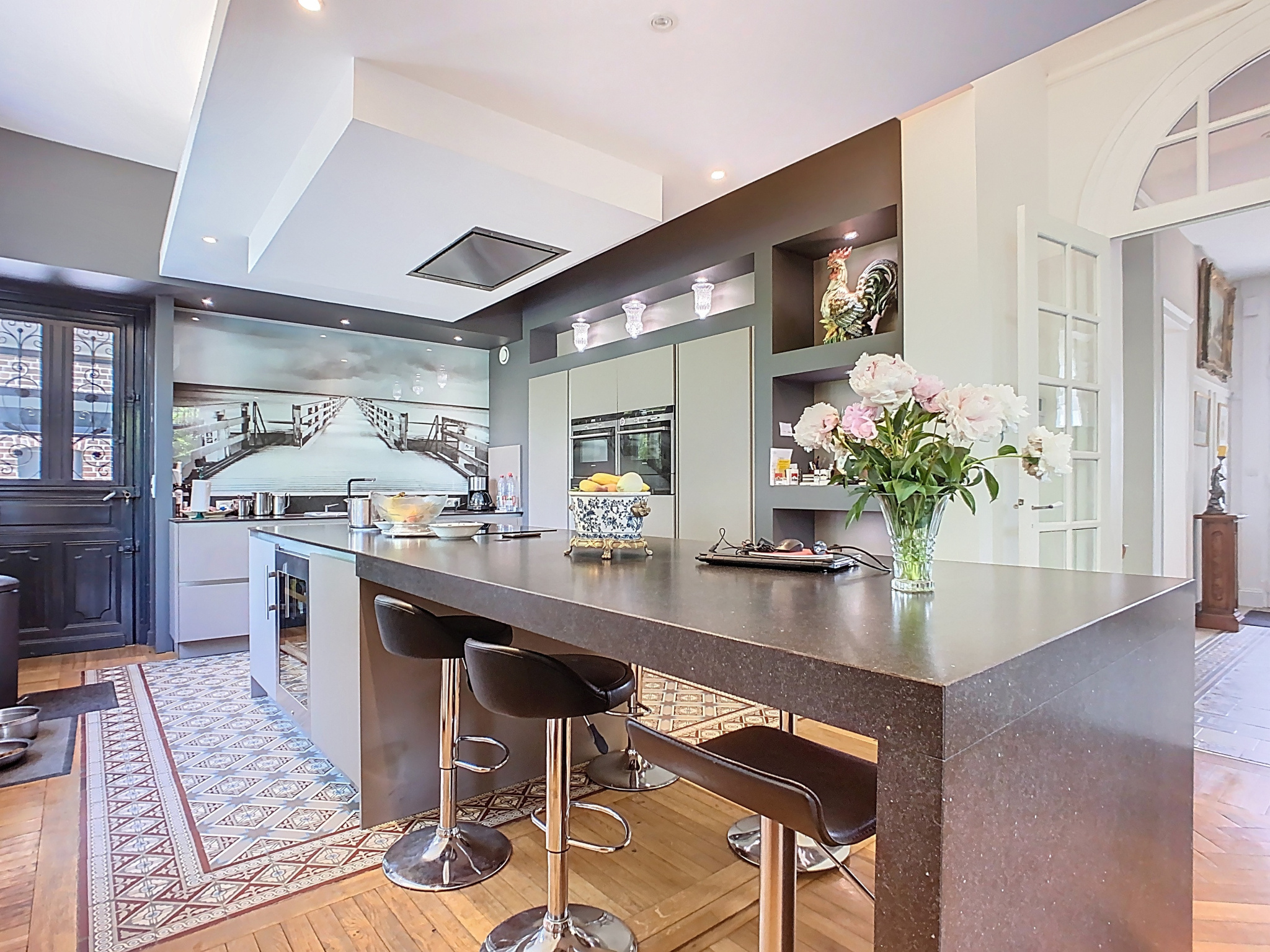 Cette propriété vous séduira dès l'entrée par le ravissant hall qui conserve au sol une belle mosaïque d'origine, un vaste salon-séjour lumineux de plus de 50 m2, sublimé par un parquet en chevrons, de superbes cheminées en marbre et une belle hauteur sous-plafond. La pièce de vie s'ouvre sur une cuisine moderne entièrement équipée. Un bureau complète ce niveau.