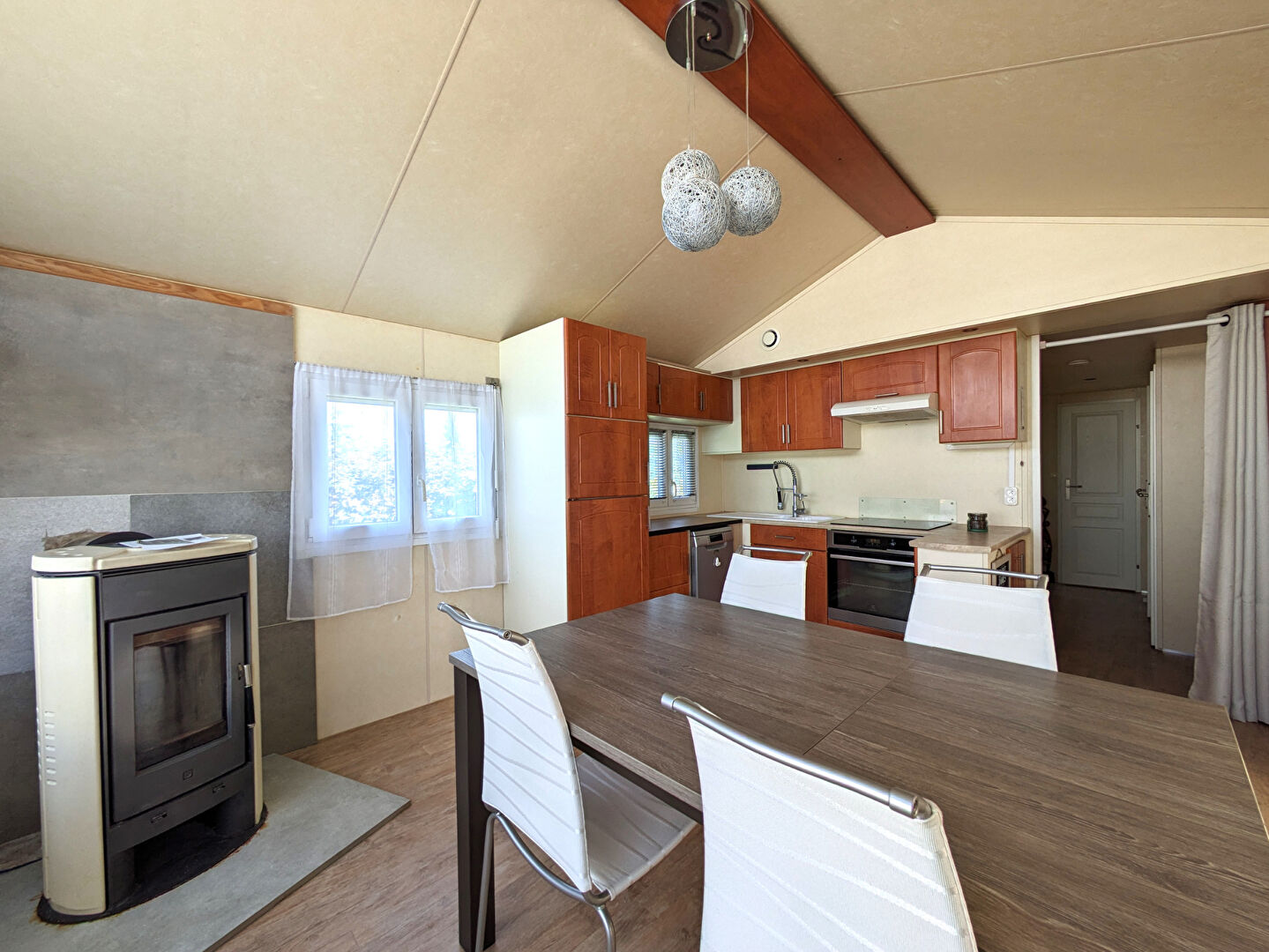 Equipé et meublé, ce mobilhome vous accueille par un salon séjour avec son poêle à bois ainsi qu'une cuisine équipée et aménagée.