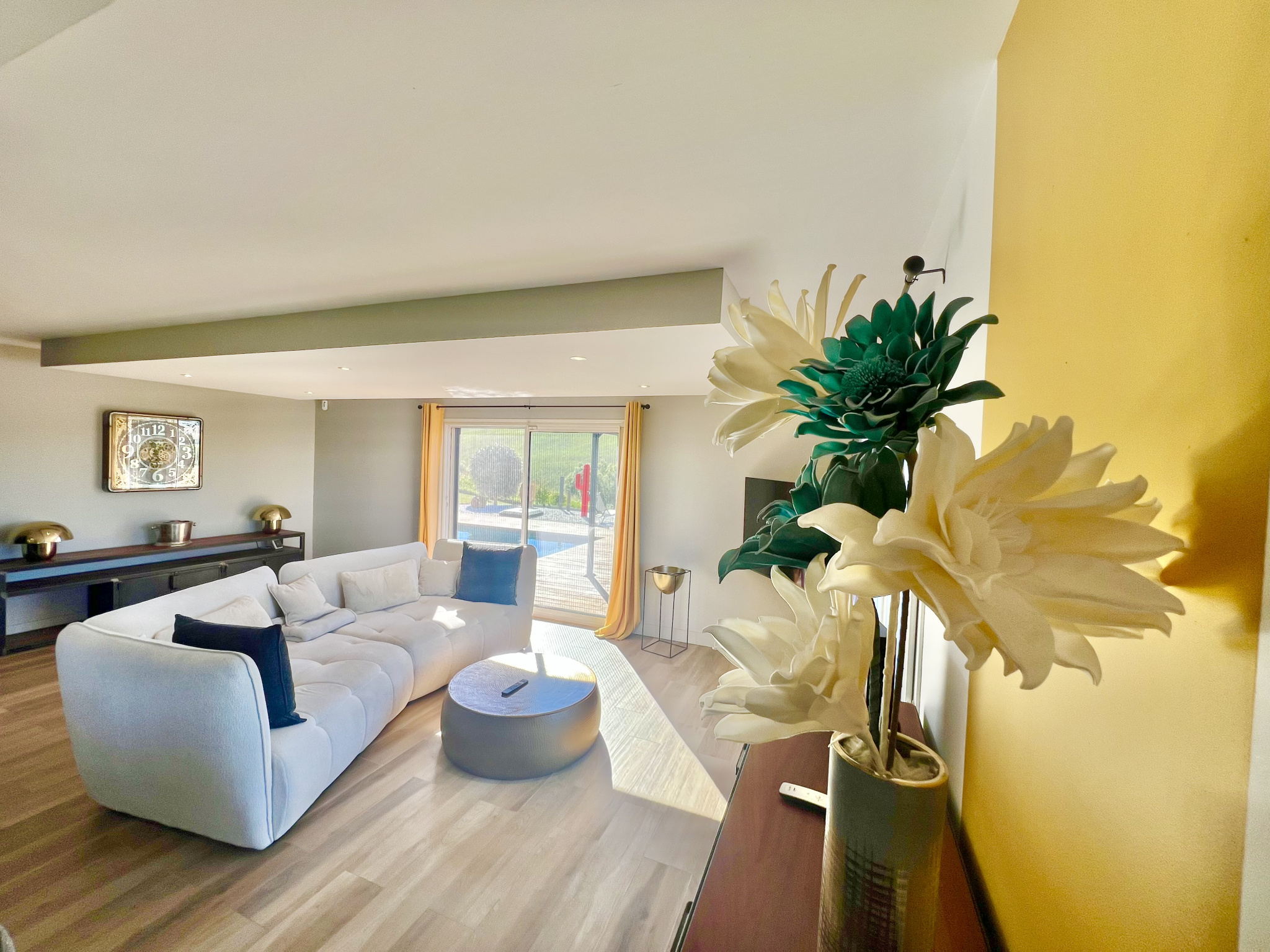 La pièce de vie de 53 m2, baignée de lumière, s'ouvre sur une cuisine contemporaine équipée et sur une vaste terrasse avec piscine et cuisine d'été.