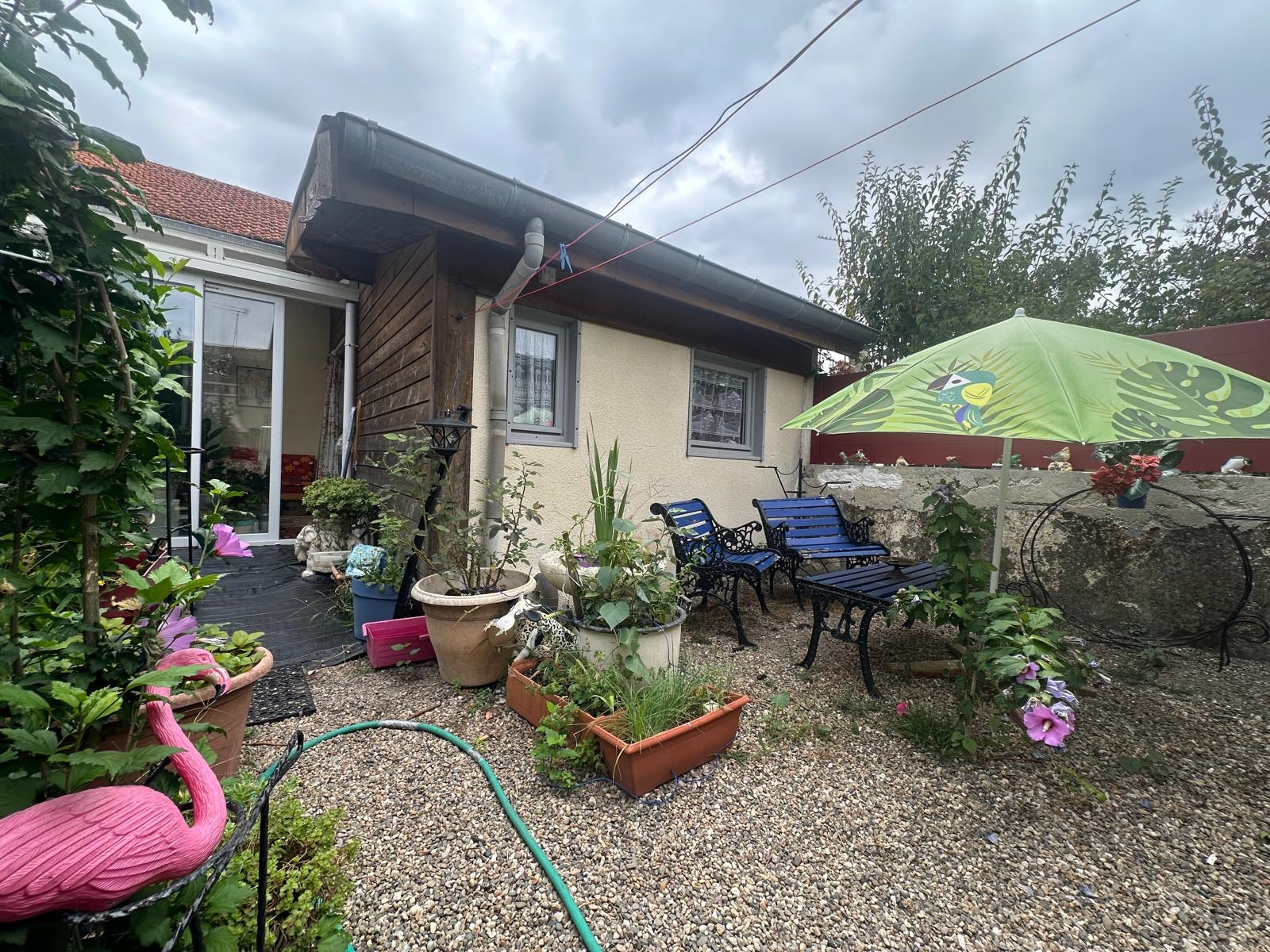 Charmante maison de ville de plain-pied avec jardinet, comprenant une vaste entrée, une cuisine ouverte sur un séjour lumineux, deux chambres, une salle d'eau entièrement rénovée avec douche à l'italienne et WC, ainsi qu'une véranda et une cave.