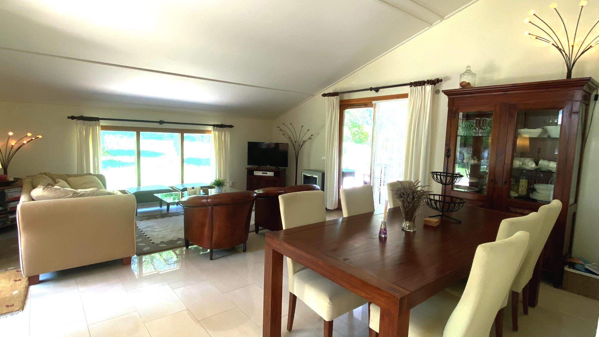 Elle se compose d'une cuisine ouverte, entièrement équipée, une pièce de vie spacieuse ouvrant sur 2 belles terrasses couvertes, 3 chambres, une salle d'eau avec wc, un wc indépendant, une buanderie, et un grand garage de 30 m2 avec rochelle, et possibilité d'aménager la moitié en quatrième chambre;