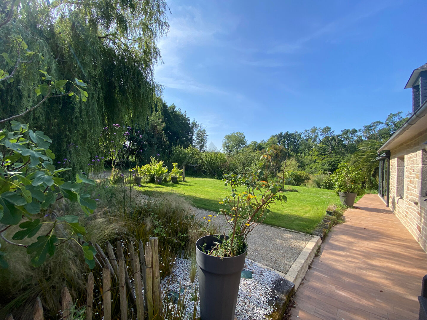 A l'extérieur, profitez d'une grande terrasse exposé plein Sud, dont une partie ombragée. Le tout s'étend sur plus de 4800 m² de terrain paysager, avec verger et ruisseau traversant la propriété.
