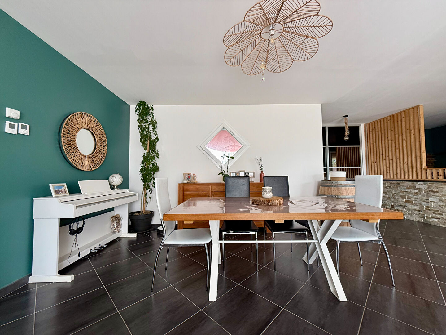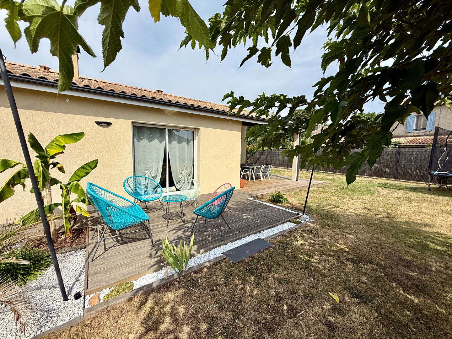 Sa pièce de vie lumineuse est composée d'une grande cuisine ouverte équipée qui donne accès à la terrasse couverte et au jardin.