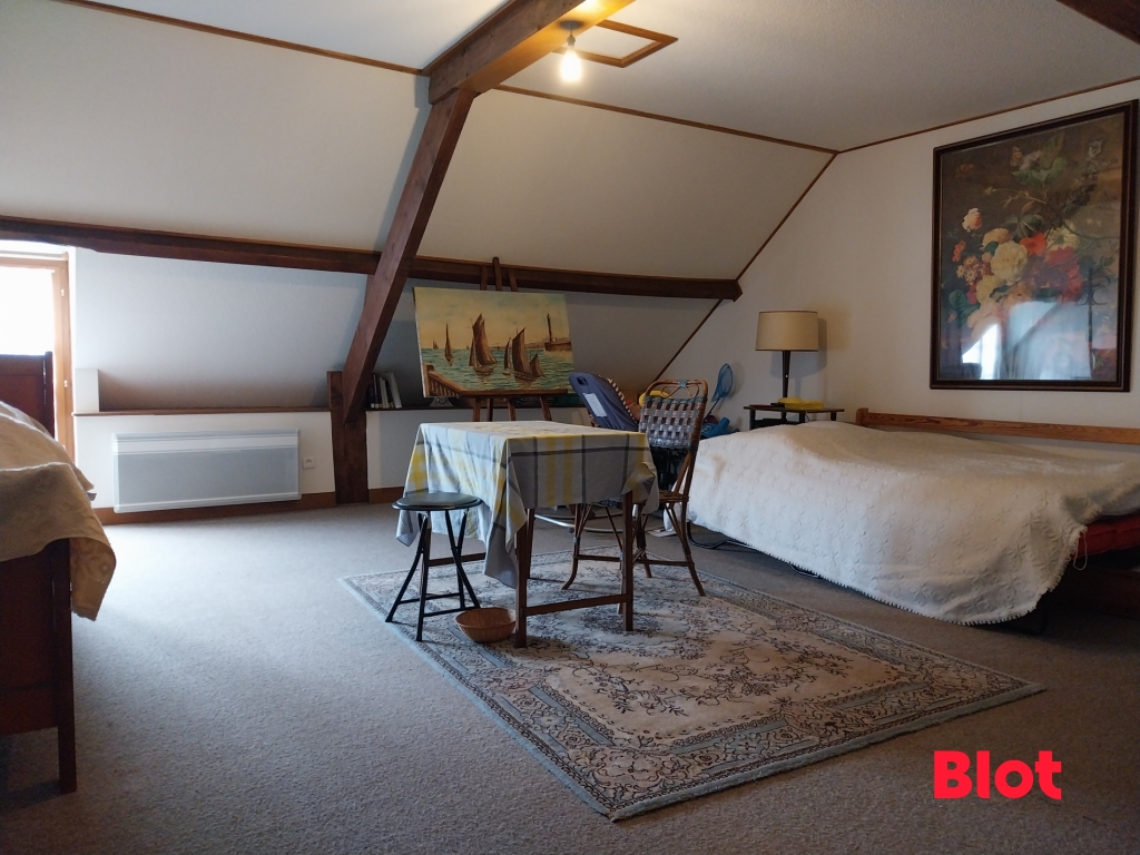 À l'étage, deux chambres et une salle d'eau avec WC. Une troisième chambre est aménagée sous combles.