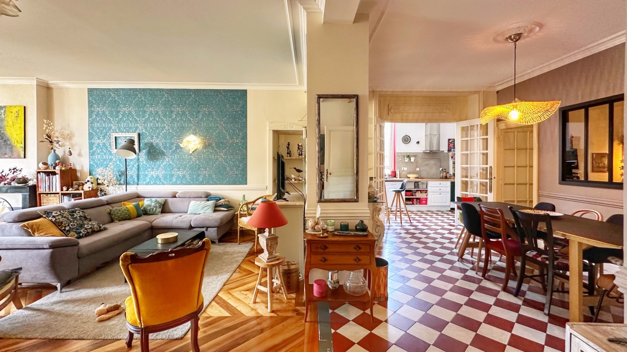 L’appartement se compose d’un hall d’entrée avec placard, d’un spacieux salon de 50,58 m² avec deux cheminées décoratives, d’une cuisine équipée (four, hotte, plaque induction) de 14,90 m² avec cellier et d’une salle à manger de 14,73 m² avec placard d’angle.