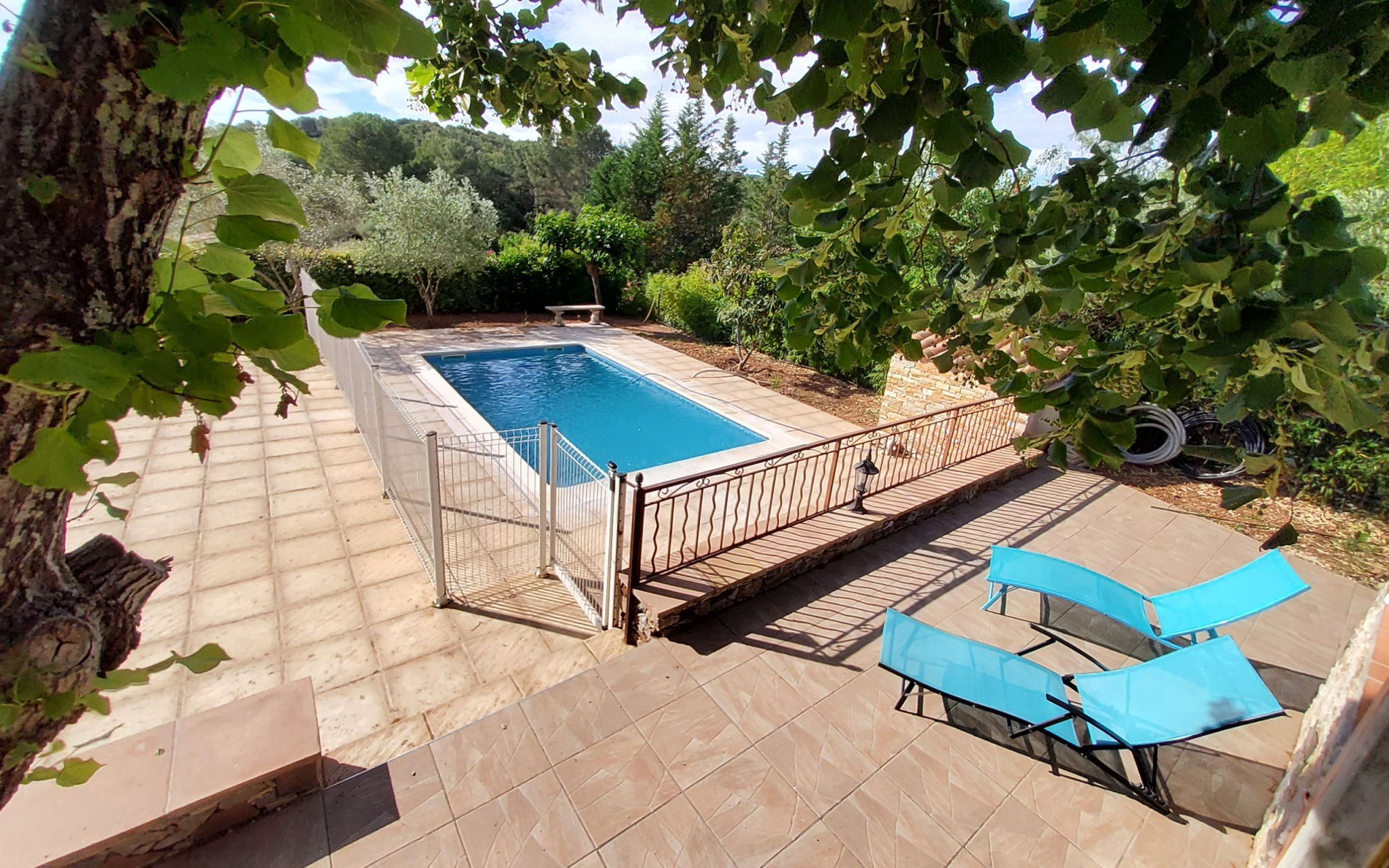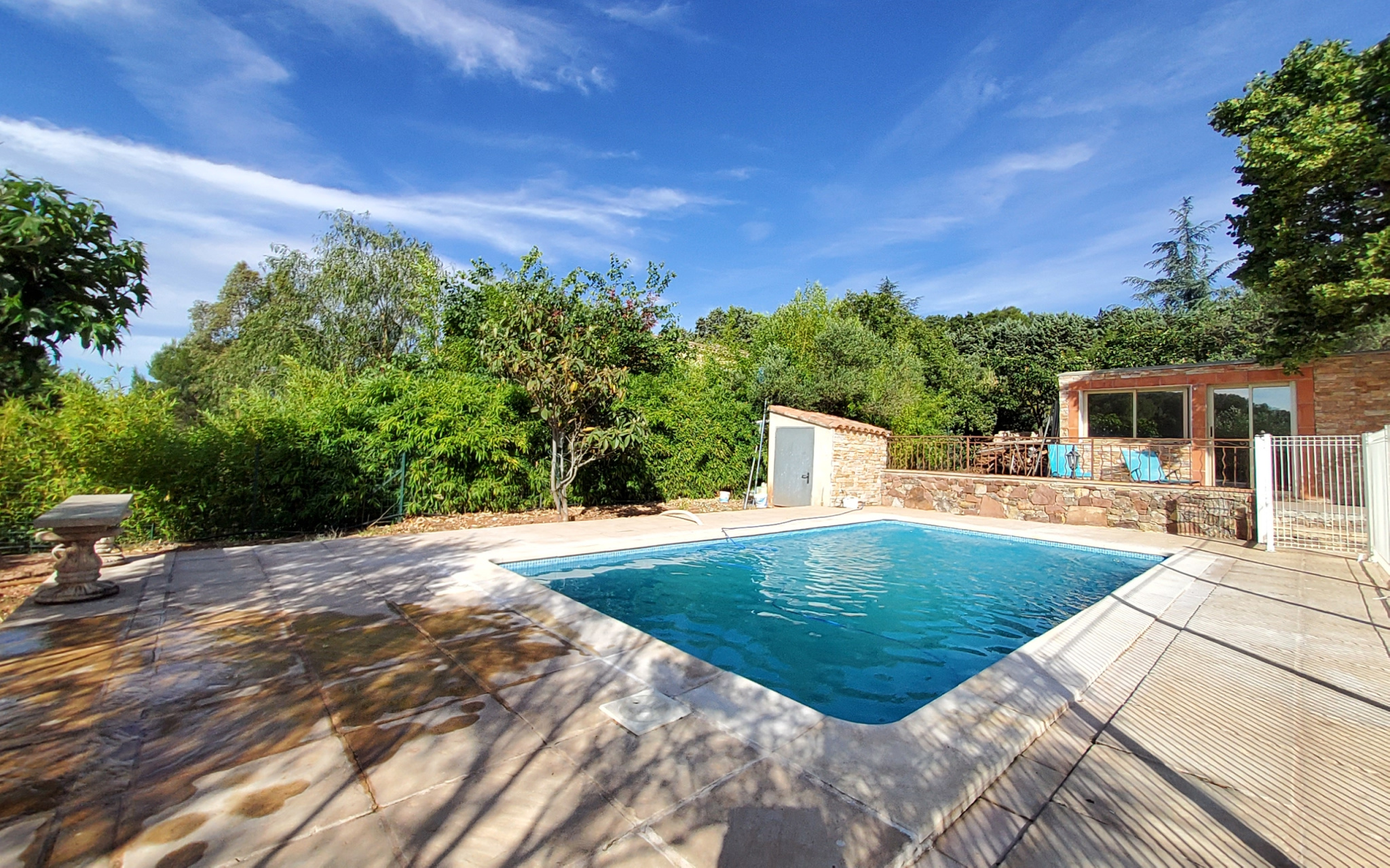 Vous apprécierez les extérieurs, une grande terrasse donnant sur une piscine traditionnelle, un cabanon en pierre avec cusine d'été, un abri voiture et un garage d'environ 32m2 et une grande aire de stationnement.