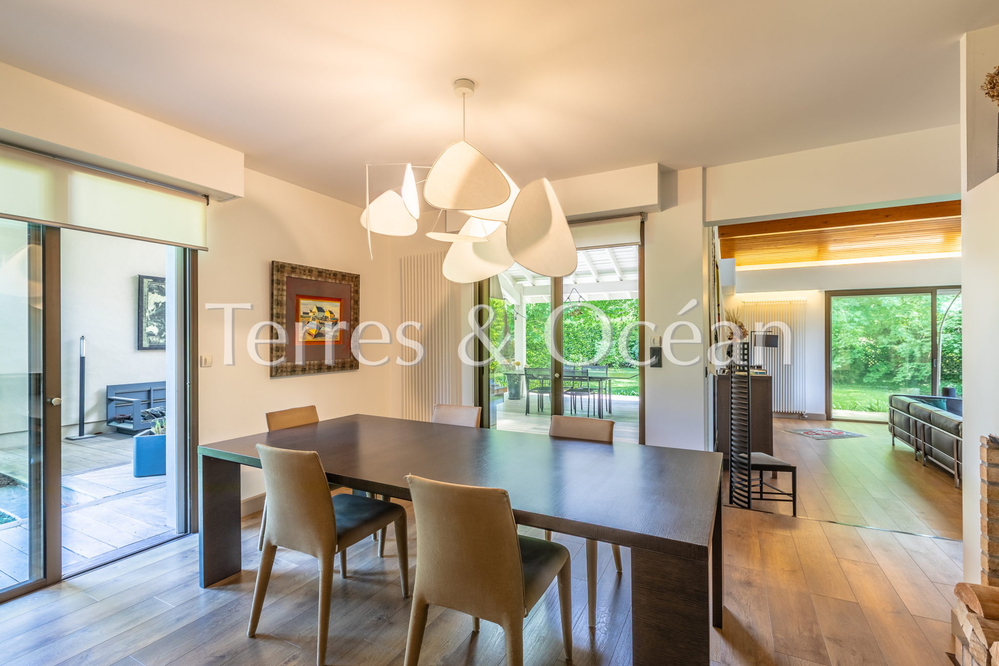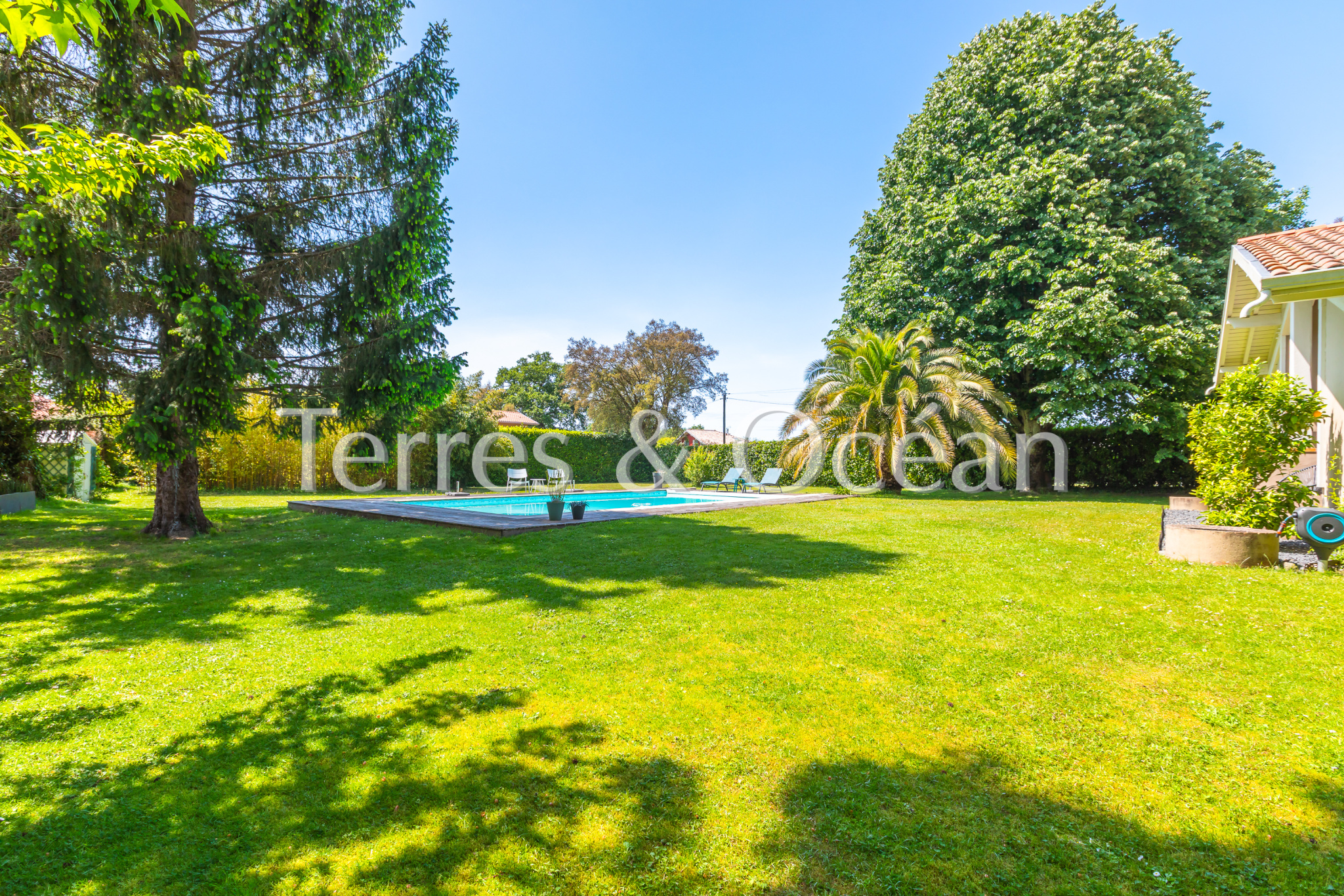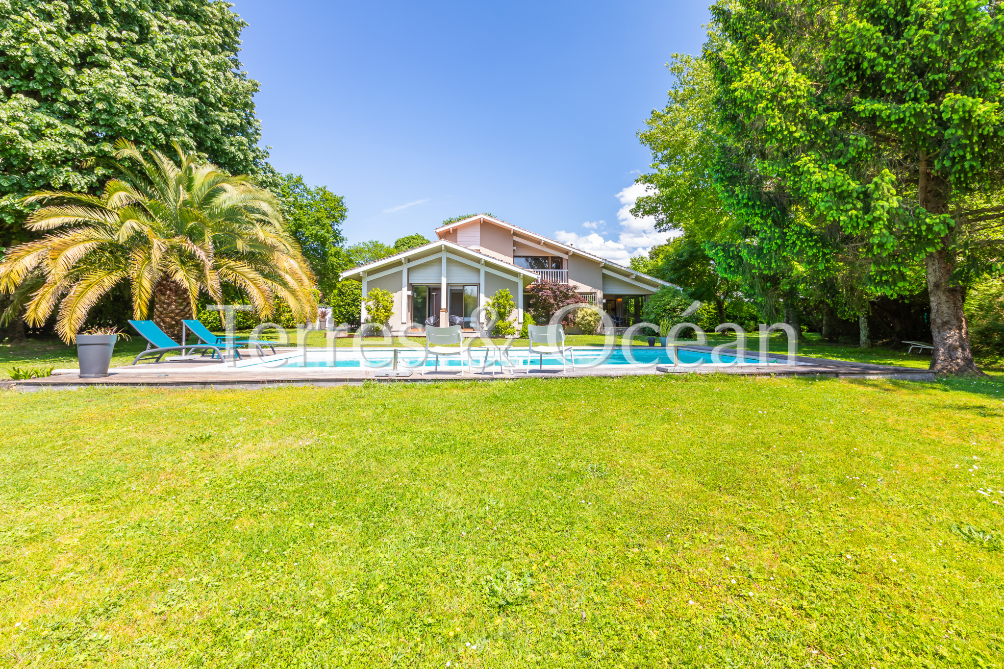 Au calme, proche du centre d'un village, à 12 min d'Hossegor et des plages, villa avec annexe en très bon état d'entretien. Bien exposée sur une parcelle joliment arborée de 3 200 m2, cette maison de construction traditionnelle de 1984 offre de beaux volumes, et une surface habitable de 243 m2, à laquelle s'ajoutent les 57 m2 de la maison d'amis. La maison principale dispose d'un beau séjour avec cheminée, baigné de lumière et largement ouvert sur l'extérieur, d'une cuisine séparée, de cinq chambres plus un bureau. En surfaces annexes, buanderie, cellier, double garage et atelier, grande terrasse partiellement couverte, piscine. Les prestations sont de qualité, chauffage gaz, climatisation, volets roulants électriques, panneaux photo-voltaïques ... Ce bien de grande qualité pourra convenir en résidence principale aussi bien que pour une merveilleuse maison de vacances, mais aussi à une profession libérale avec la possibilité d'aménager la dépendance en bureau ou cabinet.