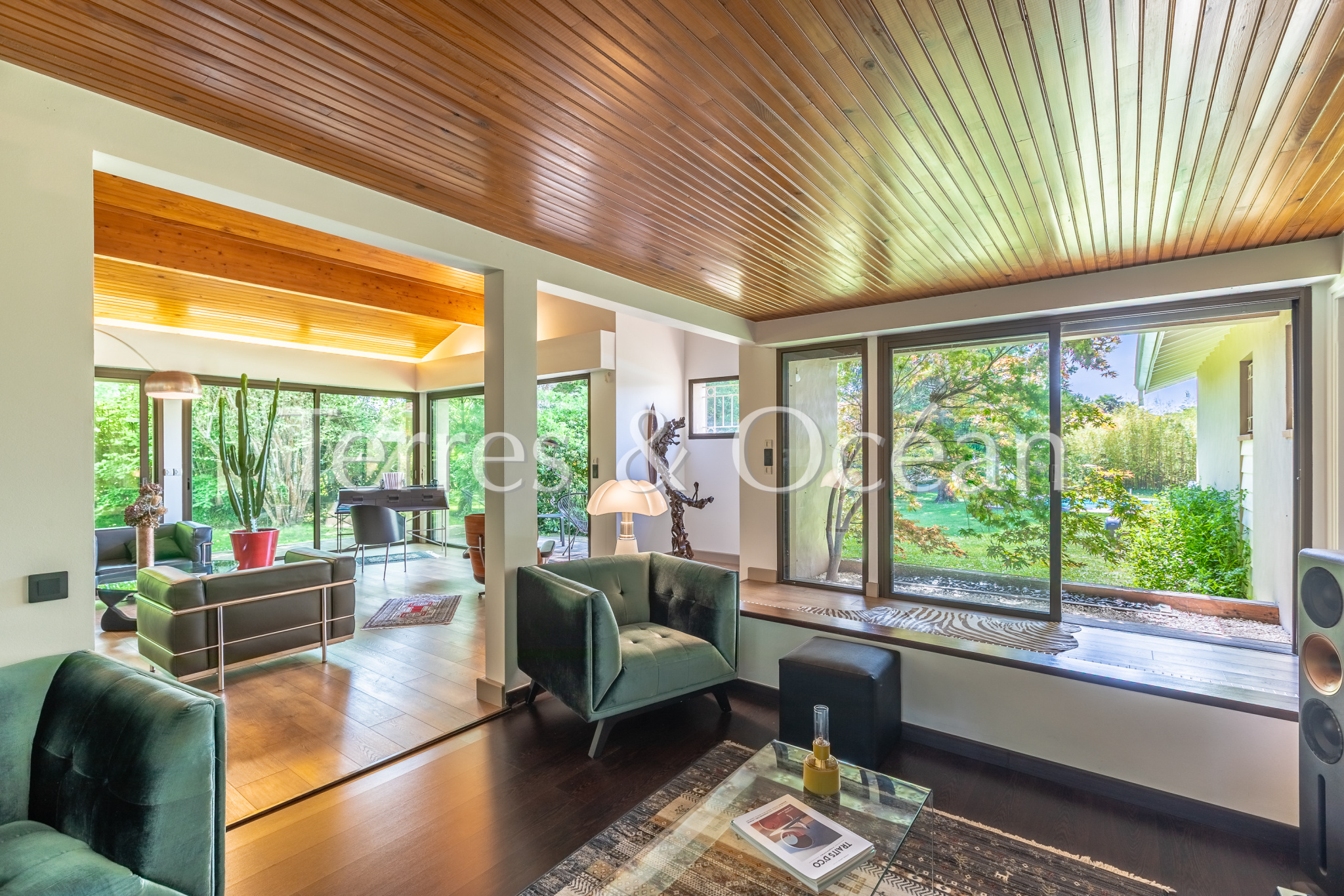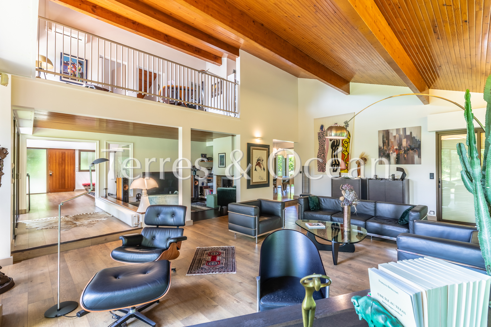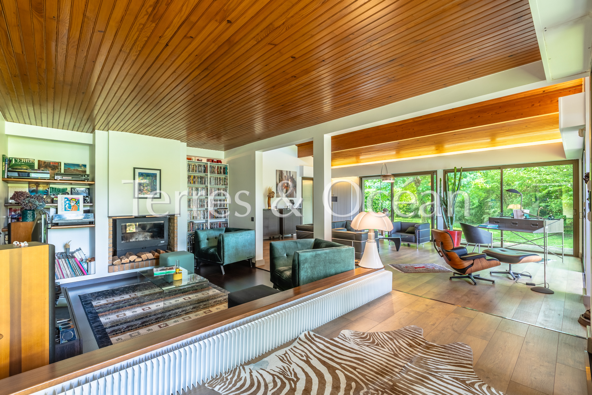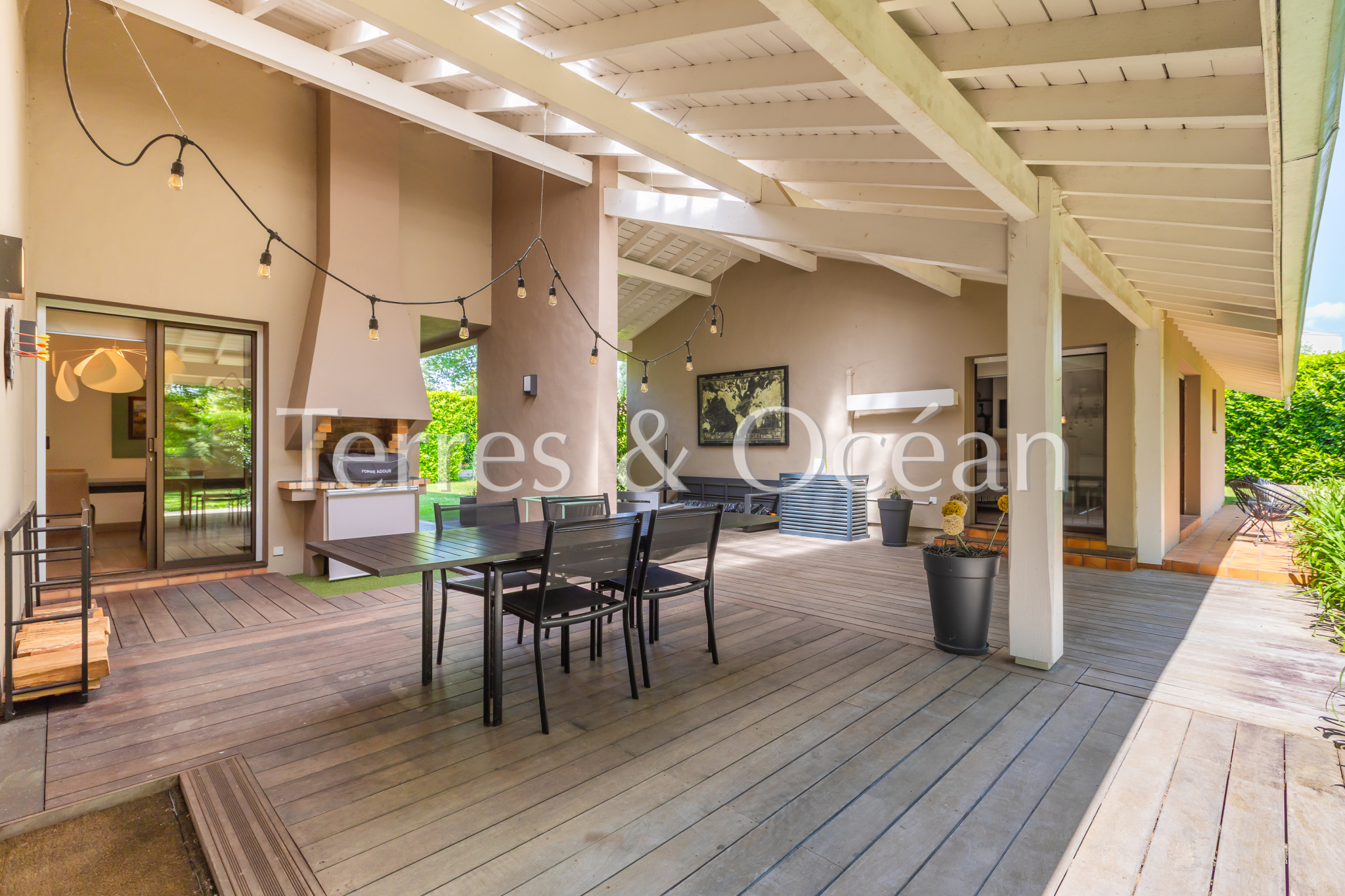 Au calme, proche du centre d'un village, à 12 min d'Hossegor et des plages, villa avec annexe en très bon état d'entretien. Bien exposée sur une parcelle joliment arborée de 3 200 m2, cette maison de construction traditionnelle de 1984 offre de beaux volumes, et une surface habitable de 243 m2, à laquelle s'ajoutent les 57 m2 de la maison d'amis. La maison principale dispose d'un beau séjour avec cheminée, baigné de lumière et largement ouvert sur l'extérieur, d'une cuisine séparée, de cinq chambres plus un bureau. En surfaces annexes, buanderie, cellier, double garage et atelier, grande terrasse partiellement couverte, piscine. Les prestations sont de qualité, chauffage gaz, climatisation, volets roulants électriques, panneaux photo-voltaïques ... Ce bien de grande qualité pourra convenir en résidence principale aussi bien que pour une merveilleuse maison de vacances, mais aussi à une profession libérale avec la possibilité d'aménager la dépendance en bureau ou cabinet.