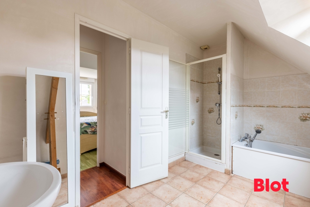 À l'étage, un palier dessert trois chambres confortables, une salle de jeux, une salle de bains équipée d'une baignoire et d'une douche, ainsi qu'un second WC indépendant.