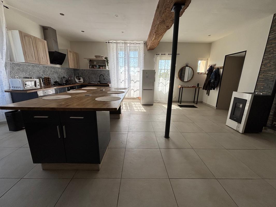 Au rez-de-chaussée : Une cuisine ouverte sur un vaste séjour, un coin salon, une salle de bain avec douche, un WC, un débarras.