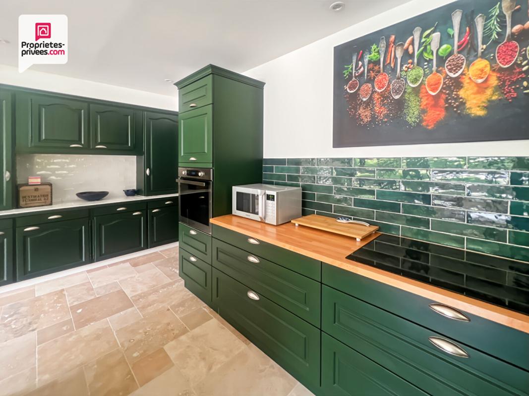 Une cuisine aménagée et équipée, offrant une vue imprenable sur le parc arboré et une buanderie complète la partie jour.