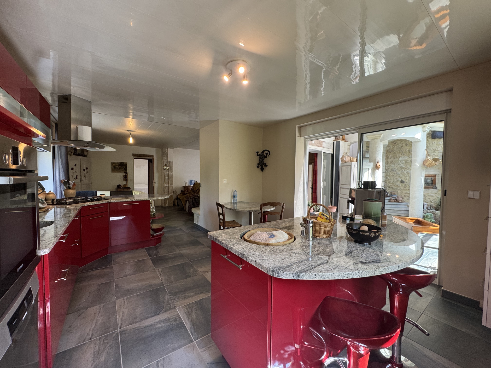 Vous commencerez la visite par la maison principale d'environ 253m2. Elle se compose, au rez-de-chaussée d'une véranda, d'une pièce de vie d'environ 53m2 avec cheminée et d'une spacieuse cuisine ouverte Schmidt pour concocter de bons petits plats à vos proches.