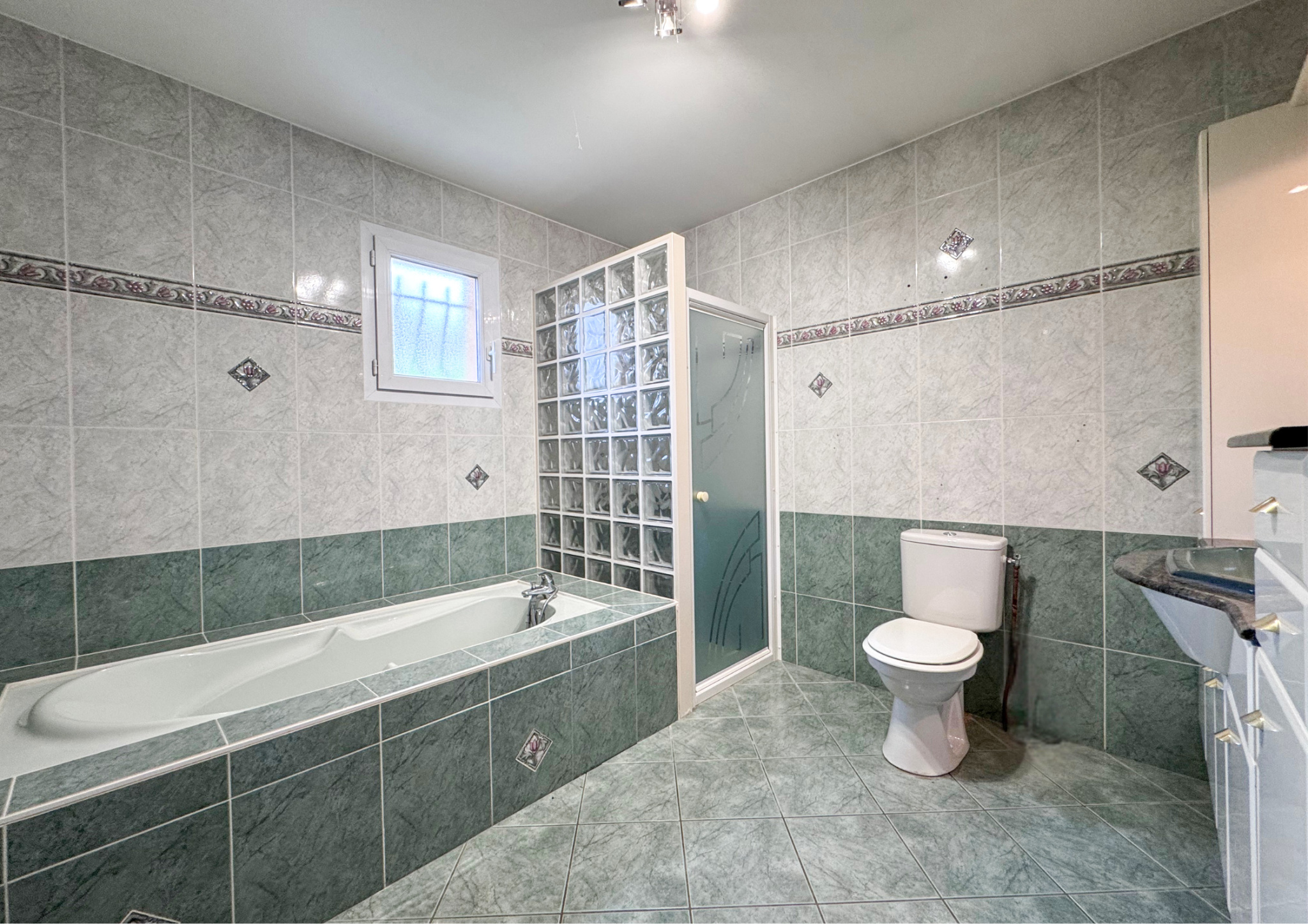Salle de bain de 9 m2 : baignoire, douche, simple vasque, WC, fenêtre et VMC,