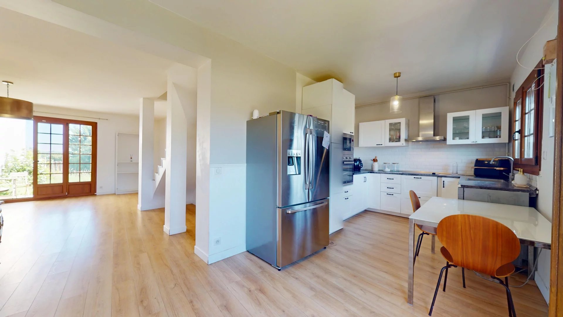 Au rez-de-chaussée, un hall d'entrée vous accueille et dessert une vaste pièce de vie lumineuse, grâce à ses deux grandes baies vitrées donnant sur le jardin. La cuisine ouverte, avec vue sur le Moulin de Montfermeil, complète cet espace de près de 50 m².