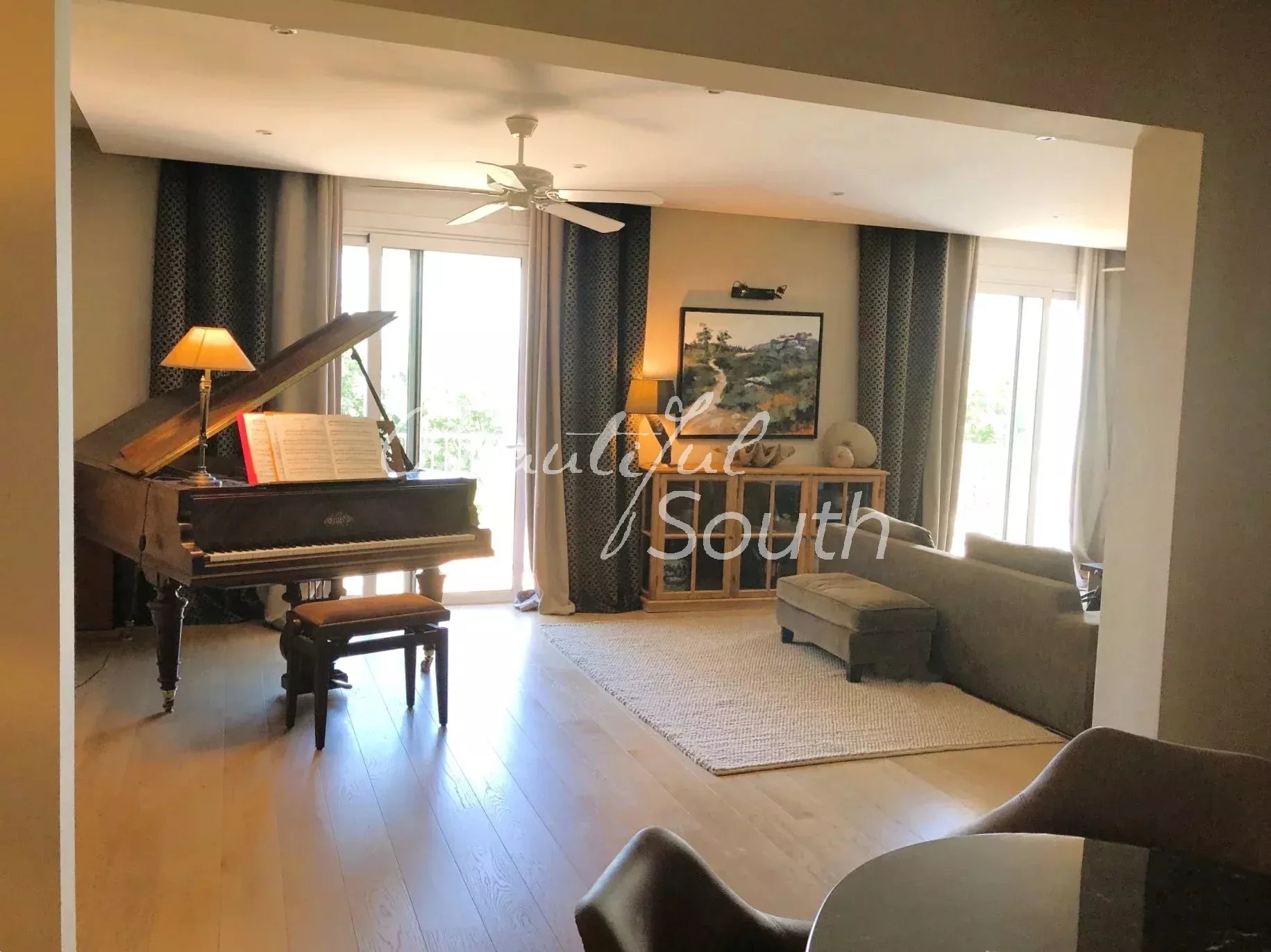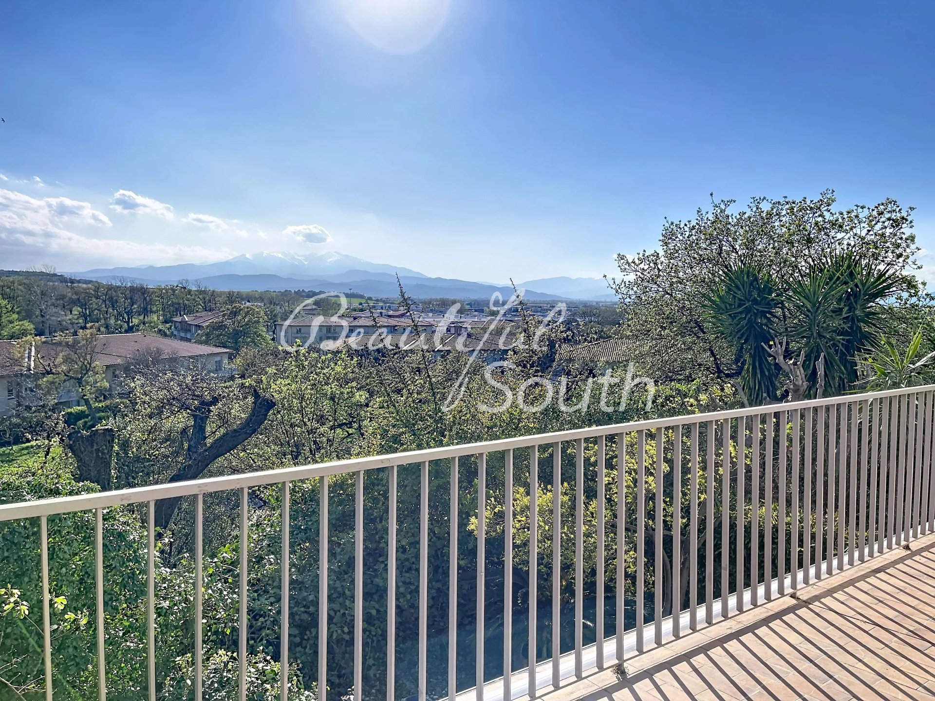 Au rez-de-chaussée, on trouve un espace de vie lumineux comprenant un salon, une salle à manger, une cuisine équipée, un bureau ainsi qu’un WC invités. Cette pièce de vie s’ouvre sur un large balcon sans vis-à-vis, offrant une magnifique vue dégagée sur le mont Canigou – un véritable lieu de détente ou de convivialité.