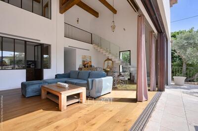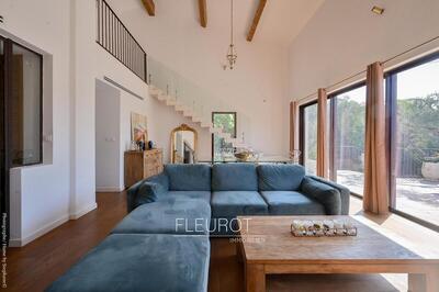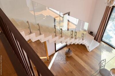Entrée sur séjour cathédrale (6.60 m de hauteur), un poêle à bois suspendu, baie vitrée de 6.40 m donnant sur grande terrasse extérieure, une cuisine avec sa verrière, aménagée et équipée, une buanderie, une chambre au rdc, une salle de bain, un dressing, à l'étage, deux chambres, une petite terrasse une salle d'eau avec wc, un dressing. climatisation réversible gainable dans la villa.