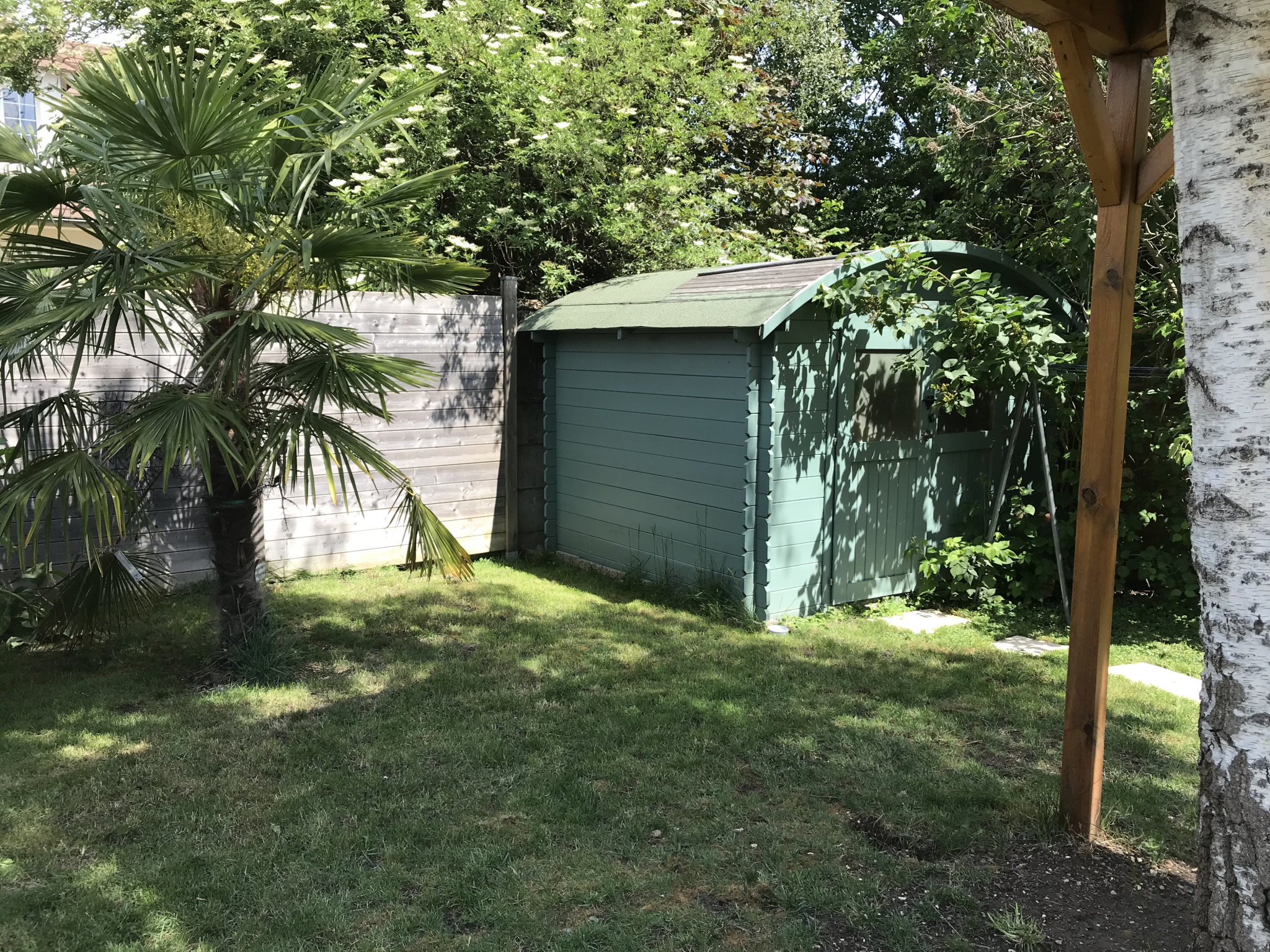 Jardin à l'arrière avec cabane en bois dans un arbre et 2 abris de jardin en bois.
