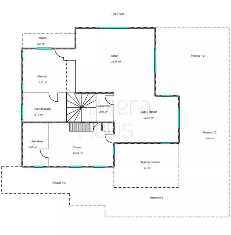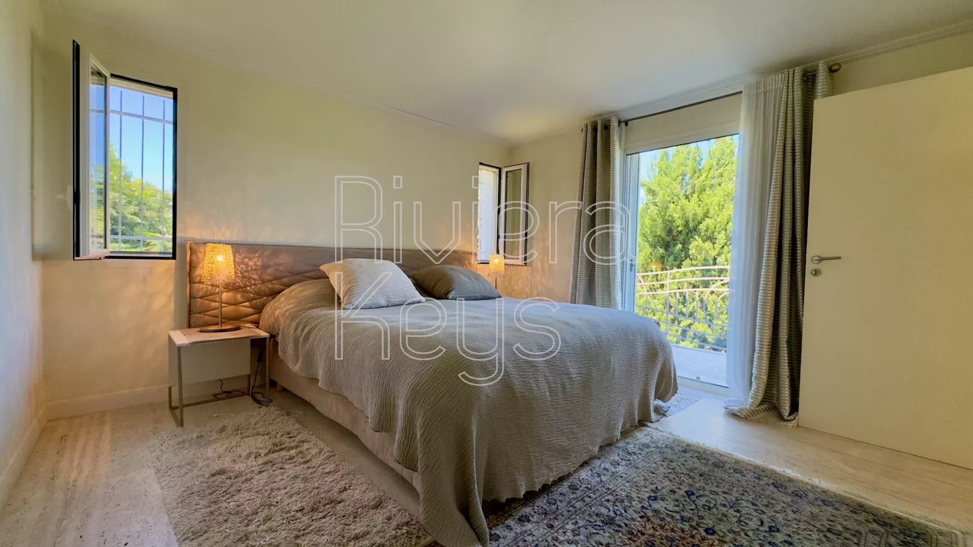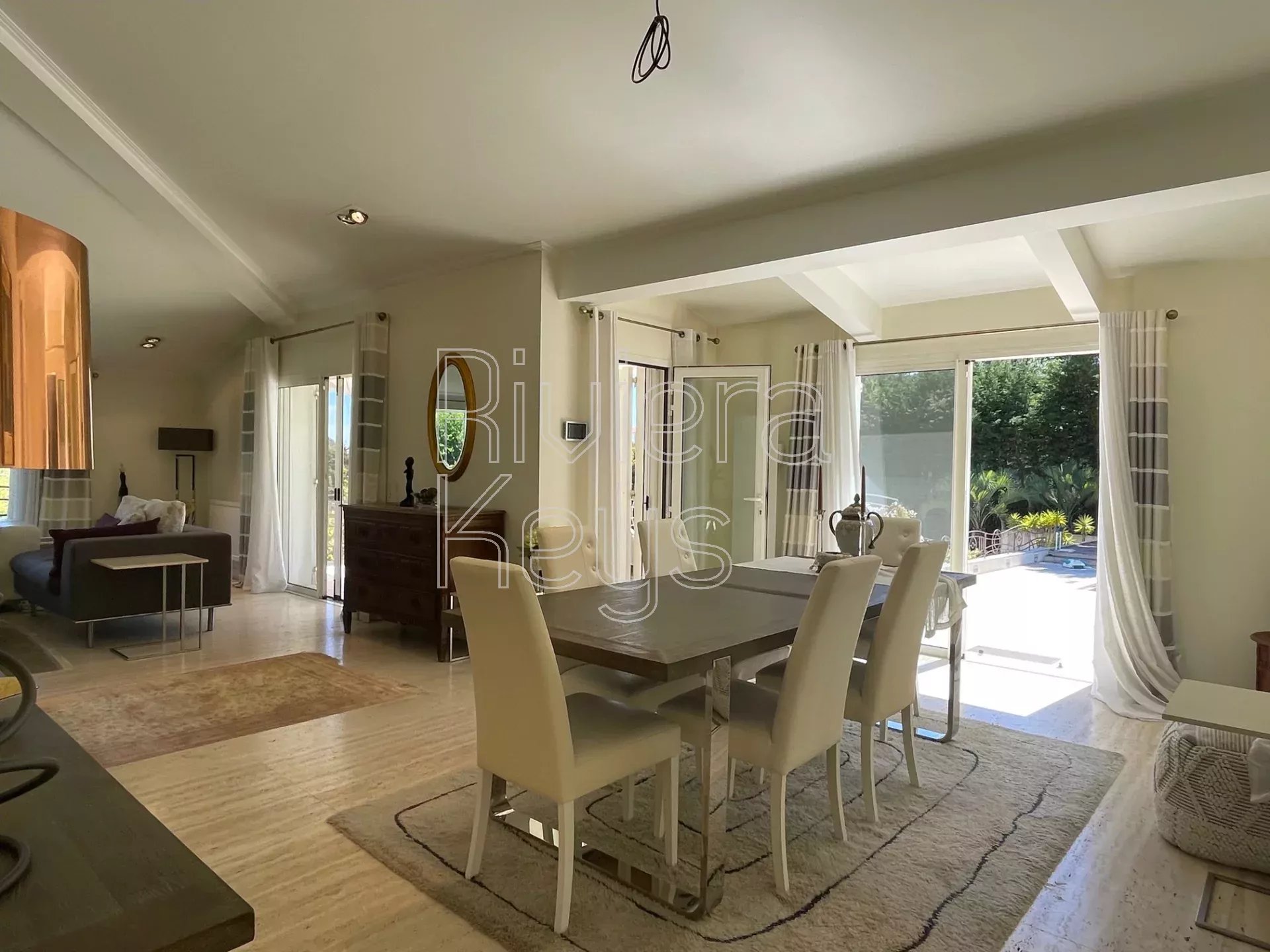 Depuis le salon et les grandes terrasses, on peut profiter d’une agréable vue sur la mer et apercevoir le bleu intense de la Riviera, apportant une touche méditerranéenne très appréciable au quotidien.