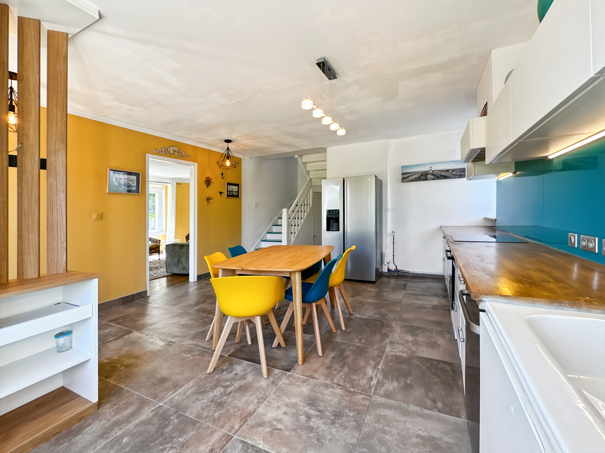 D'une surface habitable de 114 m2, cette maison lumineuse et fonctionnelle offre au rez-de-chaussée, une cuisine américaine aménagée, un salon/séjour chaleureux doté d'un poêle à bois et d'une bibliothèque murale sur mesure, un WC, un cellier ainsi qu'un garage.