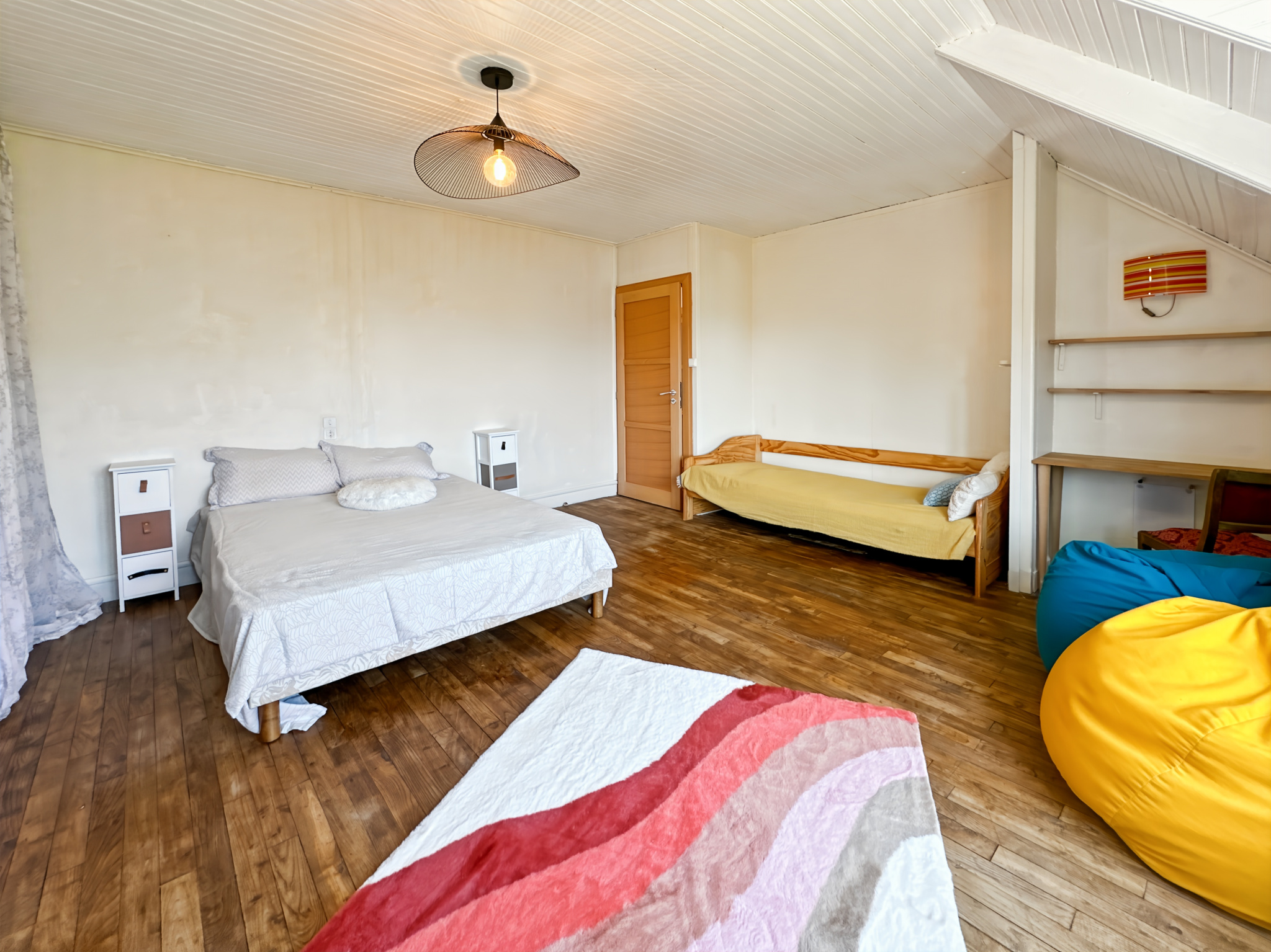 À l'étage, le palier dessert trois grandes chambres, dont deux avec rangements intégrés et d'une salle d'eau avec WC. Les combles, déjà isolés, offrent un potentiel d'aménagement supplémentaire.