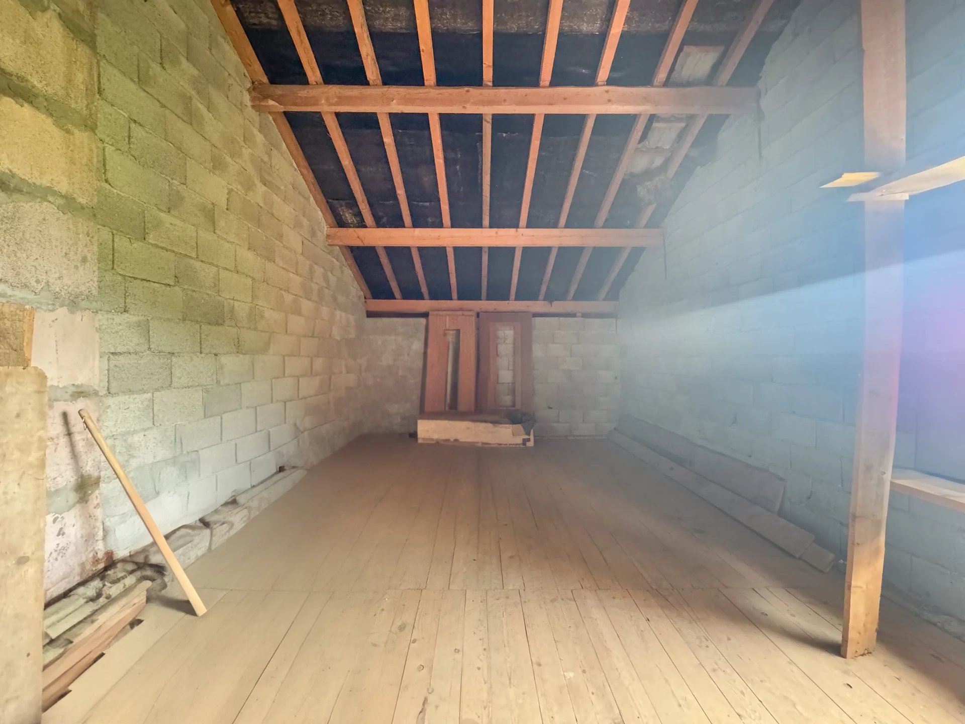Le premier niveau, actuellement habitable, se compose d’une cuisine séparée, d’un salon-séjour lumineux, de deux chambres, d’une salle d’eau et de toilettes indépendantes. À l’étage, les combles offrent un volume généreux, idéal pour créer de nouveaux espaces de vie selon vos besoins.