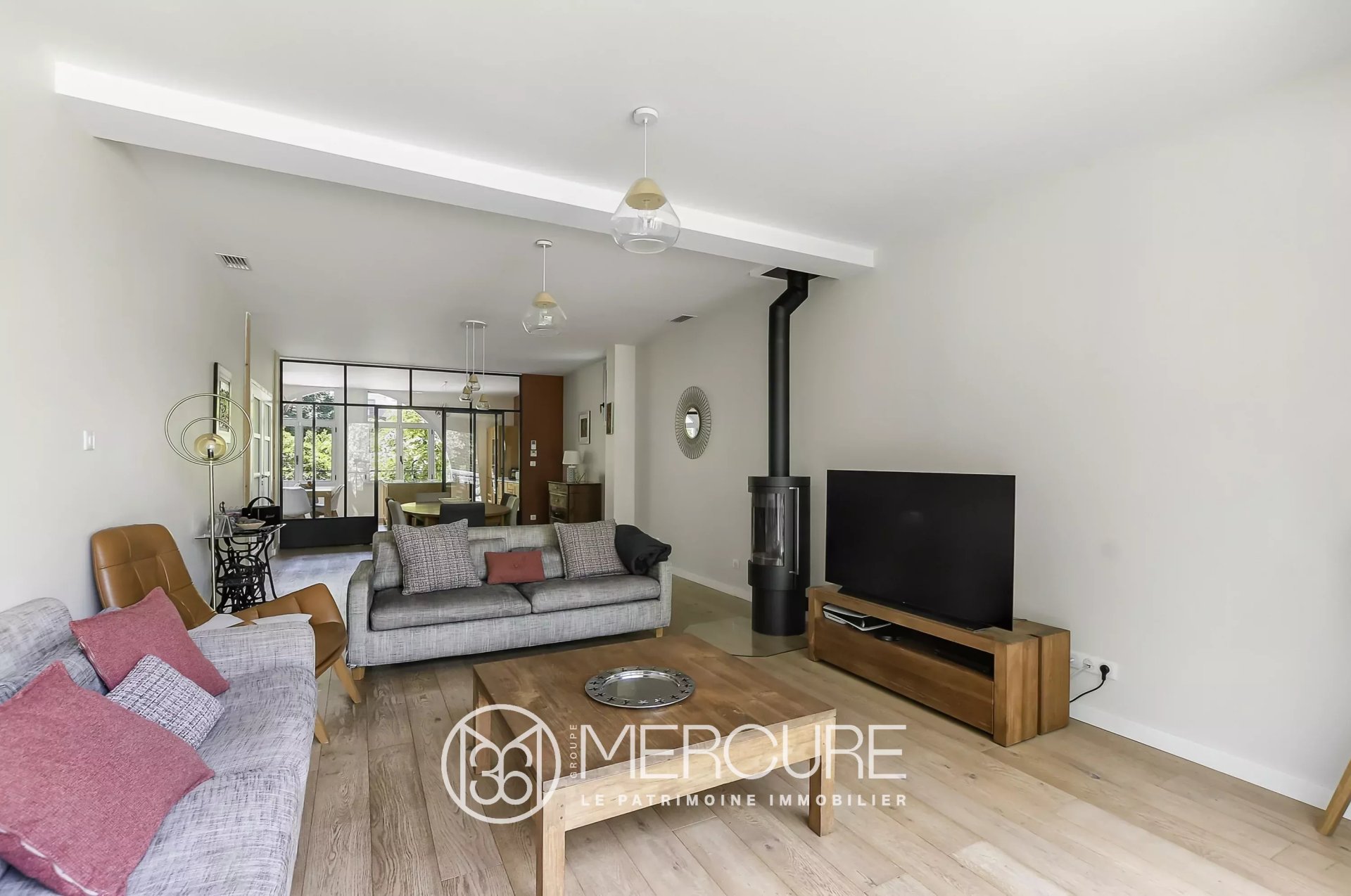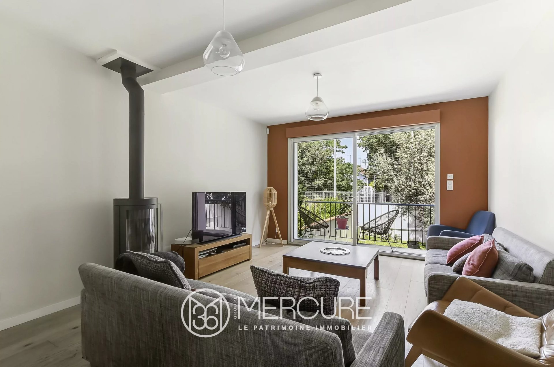La pièce de vie/salon avec cheminée donne, par sa baie vitrée, sur une petite terrasse. Un escalier extérieur permet l'accès au jardin situé à l'arrière de la maison, sur cette terrasse.