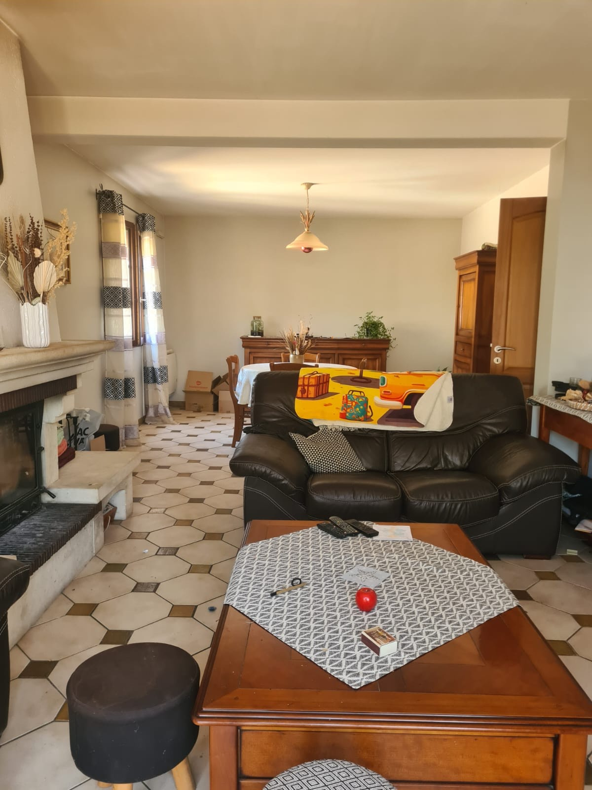 Salon/séjour lumineux avec cheminée et insert à bois, parfait pour les moments en famille,