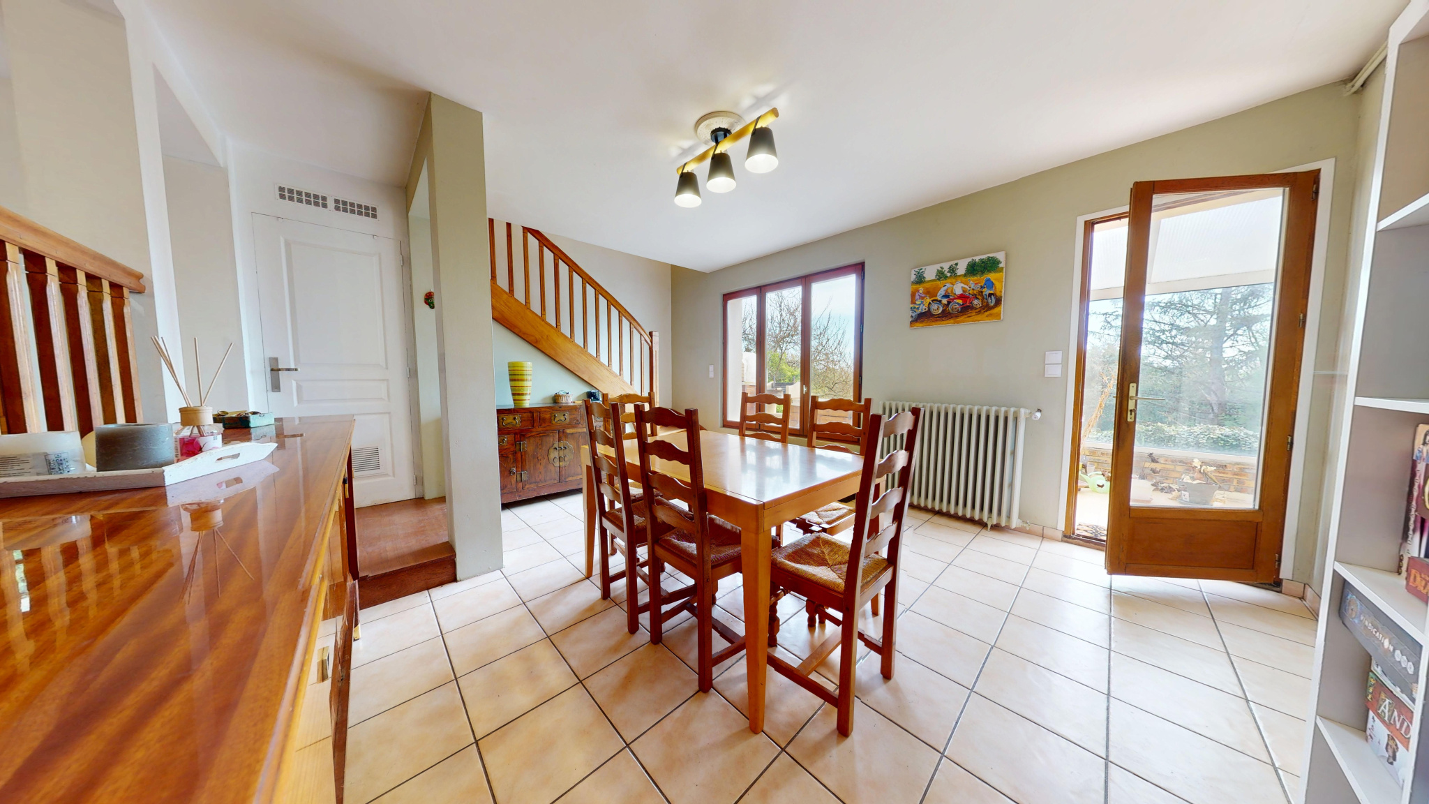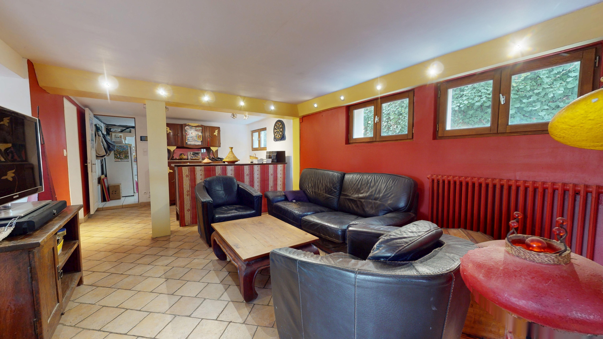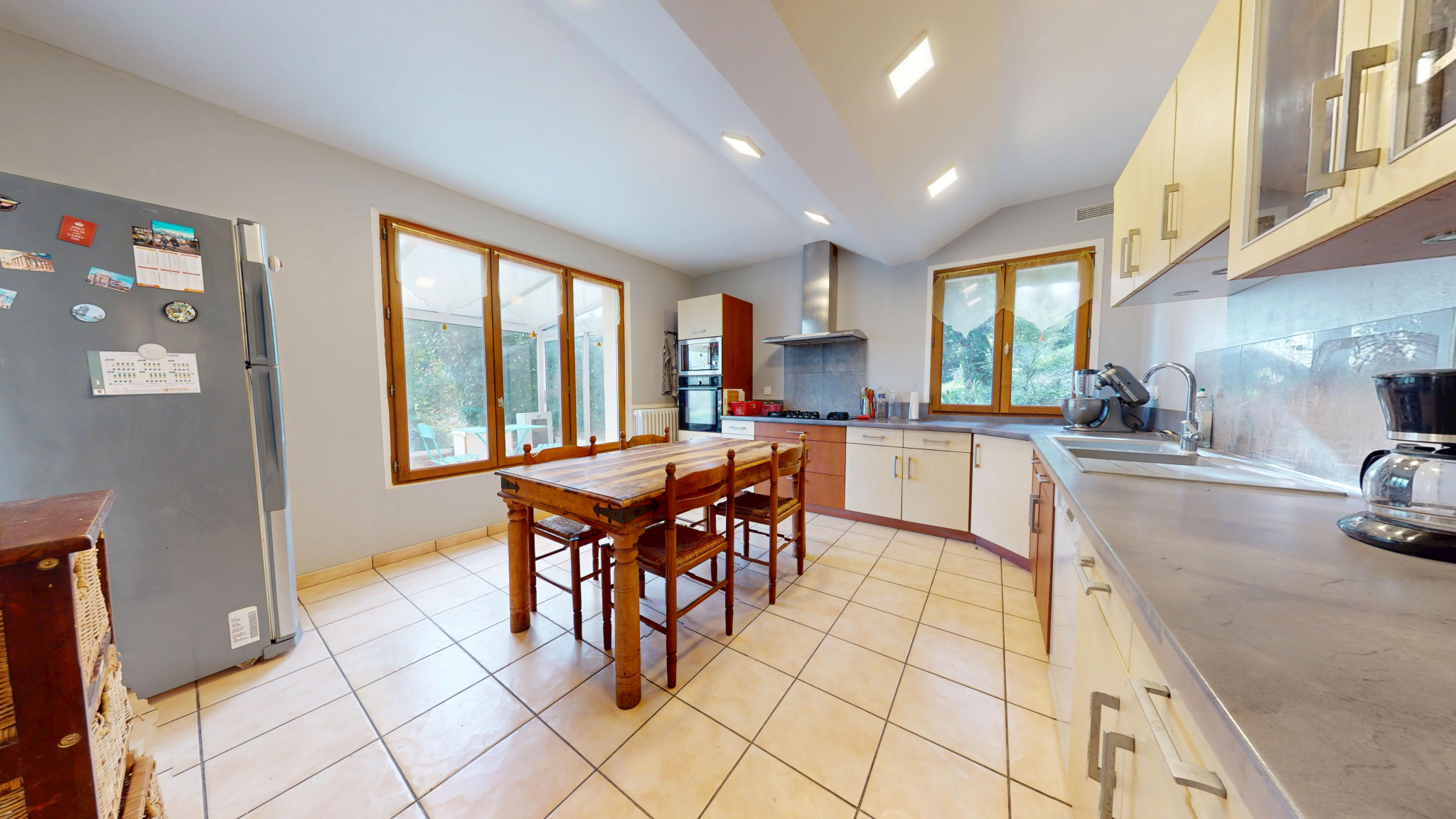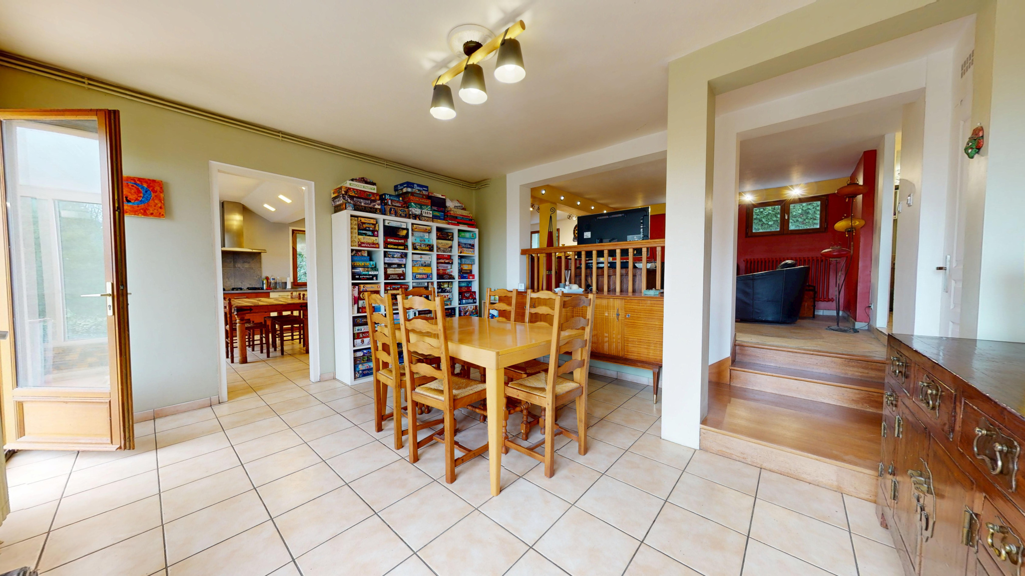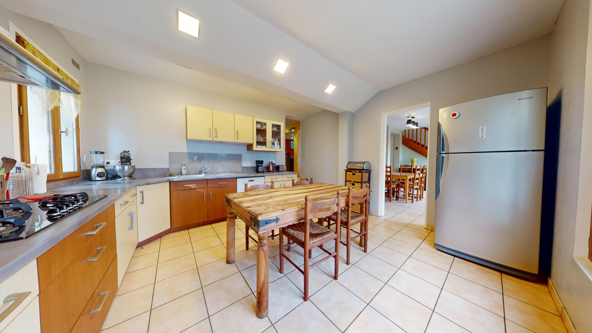 Au rez-de-chaussée : Un grand espace de vie : salle à manger et salon en demi-niveau, une grande cuisine aménagée/équipée avec cellier, WC et débarras.
