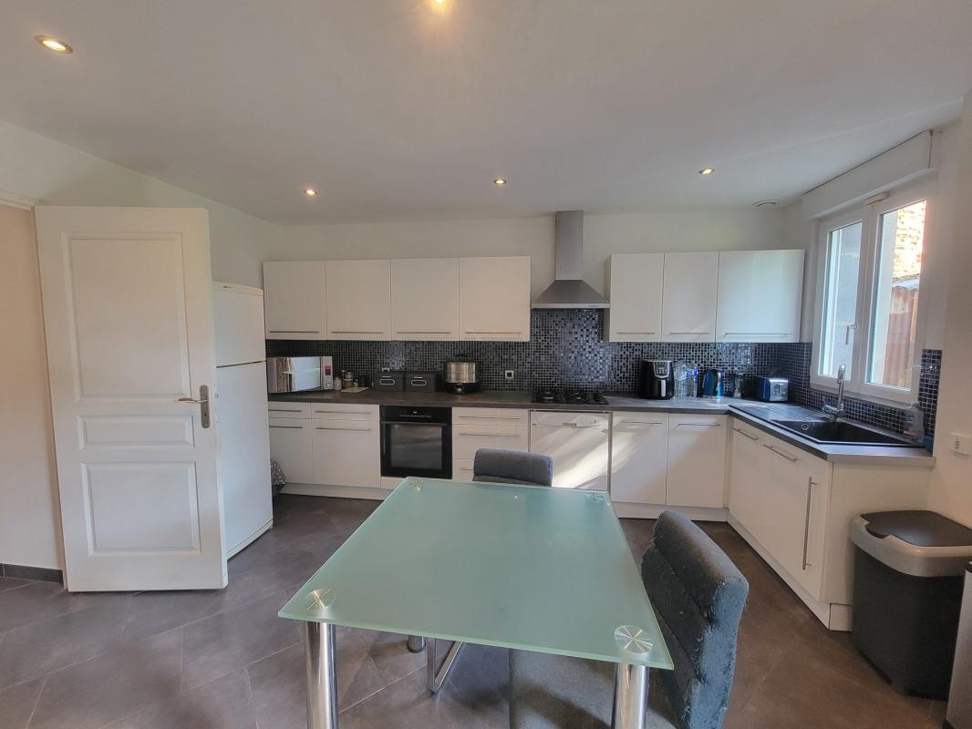 Cuisine moderne aménagée et équipée (hotte, plaques) avec accès sur l'extérieur par une porte vitrée
