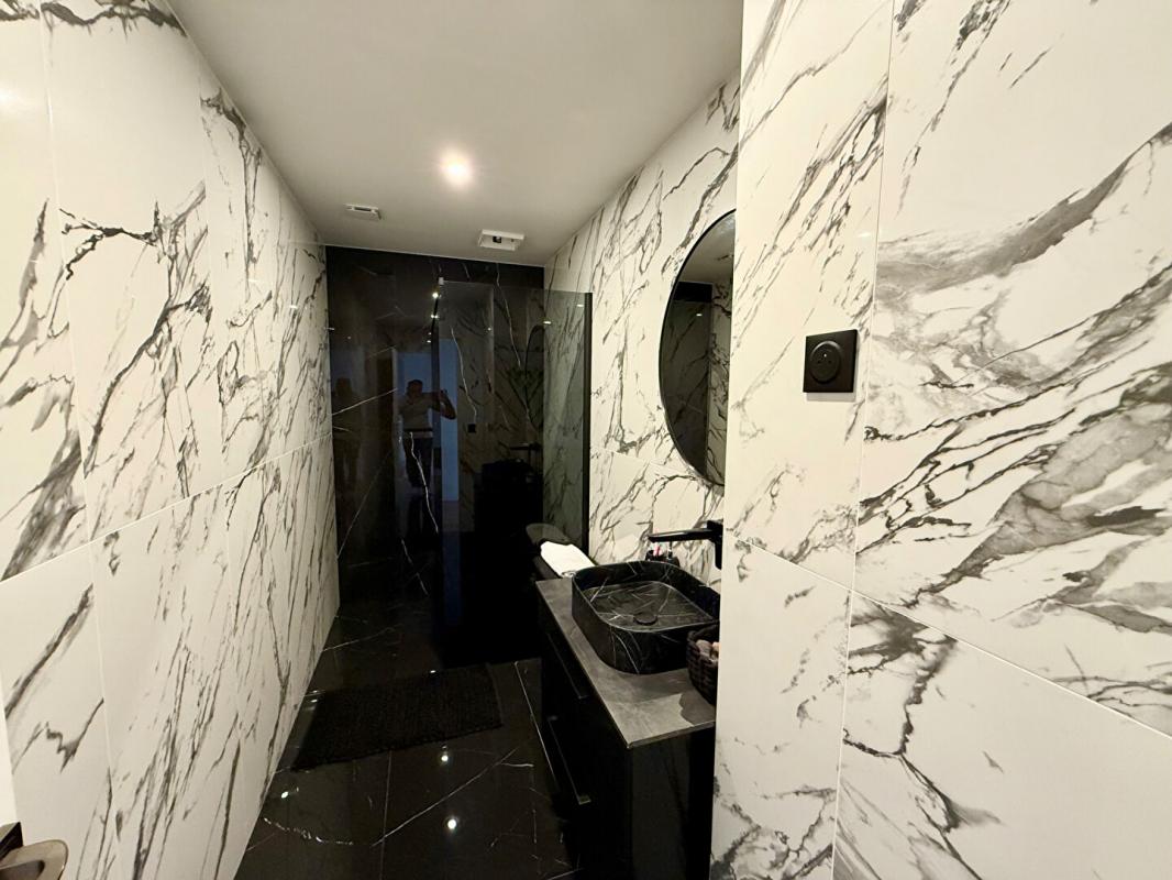 La cuisine, entièrement équipée, s'organise autour d'un îlot central élégant, pensée dans les moindres détails pour allier esthétique et fonctionnalité. Une buanderie discrètement intégrée par une porte invisible ainsi qu'un WC invités complètent ce niveau.