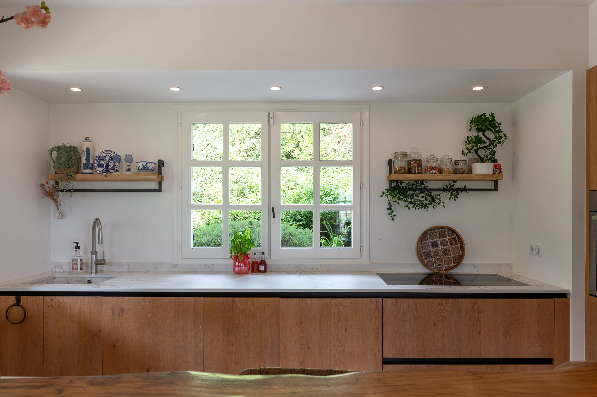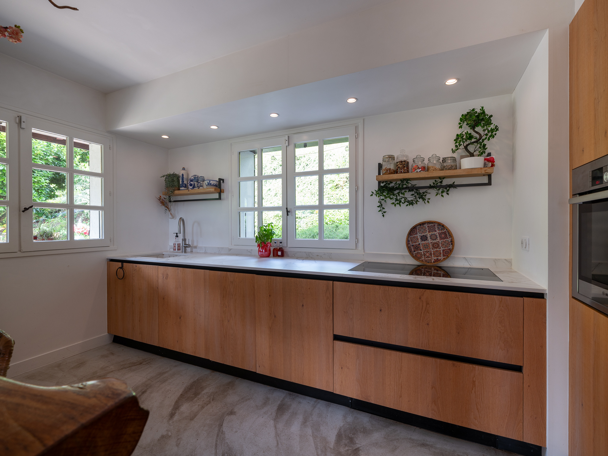 Édifiée sur un terrain de plus de 1700 m2, elle développe près de 188 m2 habitables répartis sur trois niveaux. Le niveau principal accueille un vaste espace de vie chaleureux et lumineux, avec salon cheminée, salle à manger parquetée en chêne et cuisine ouverte signée INOVA, entièrement équipée avec des matériaux haut de gamme (plan de travail en Dekton, cave à vin, électroménagers intégrés...).