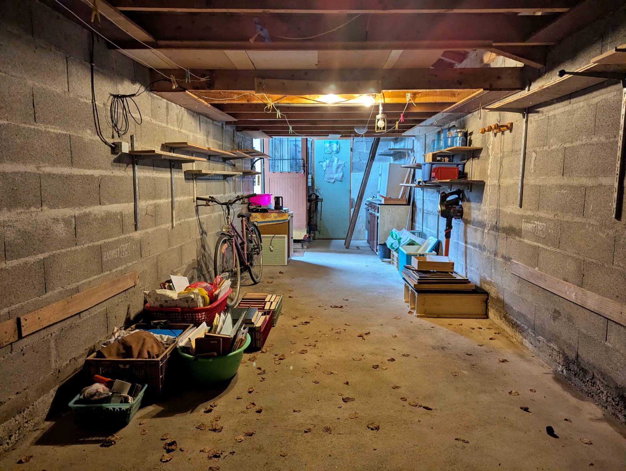 Cuisine aménagée suivie d'un cellier et d'une pièce/chambre avec un accès direct à l'extérieur.