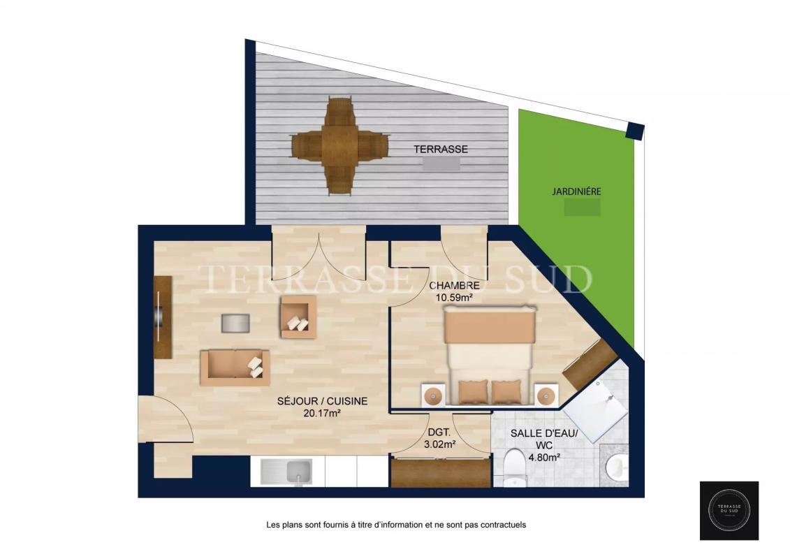 Il se situe en rez-de-chaussée d'une résidence datant de 2014. Exposé Sud-Ouest, il offre une belle pièce de vie avec cuisine ouverte (19,5 m2), une chambre (10,40 m2) ainsi qu'une salle d'eau avec toilettes. Le séjour et la chambre ouvrent sur une grande terrasse de 15 m2 environ, agrémentée d'une jardinière de 2 m2. Les fenêtres sont en double vitrage. Le chauffage individuel est au gaz.