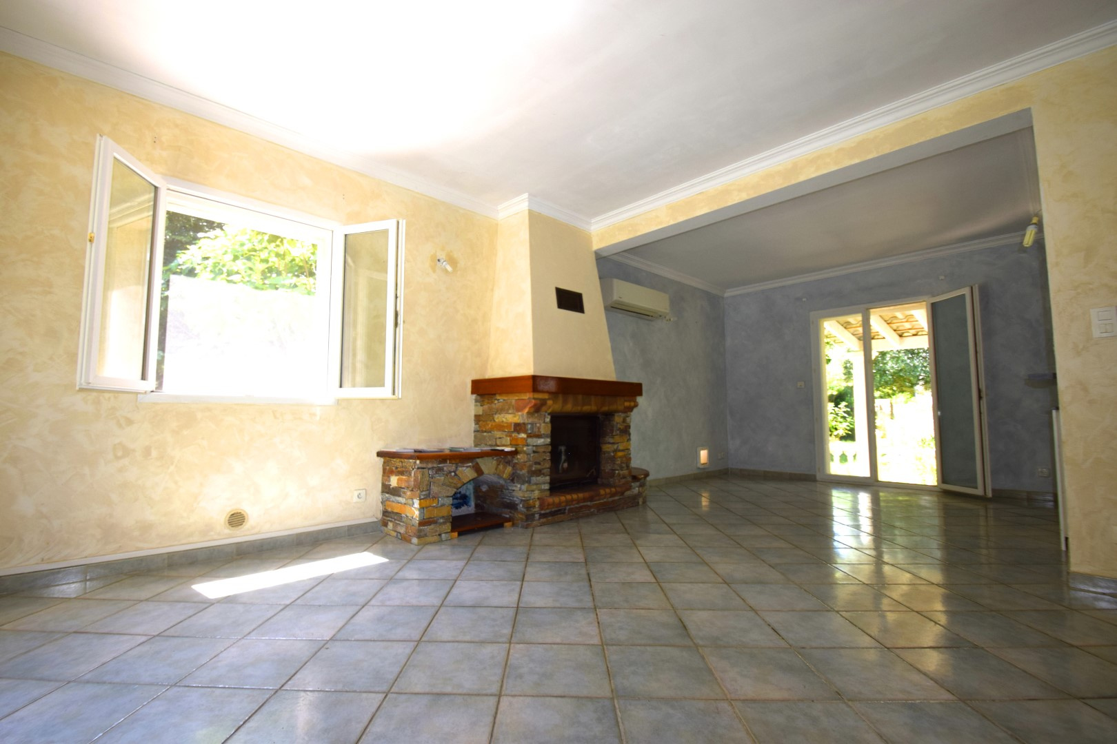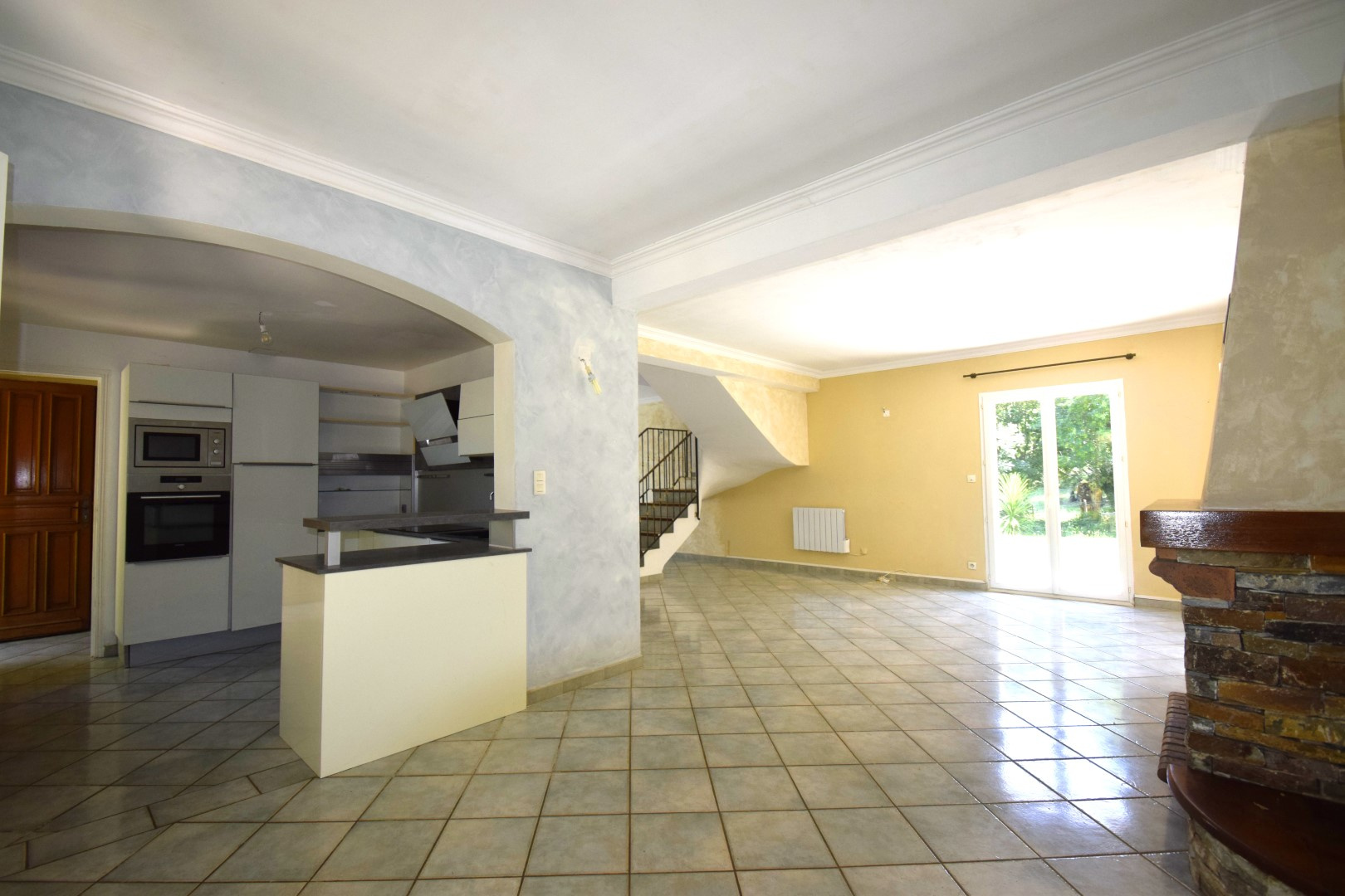 Rez-de-chaussée : cuisine ouverte, séjour lumineux avec cheminée, WC, buanderie