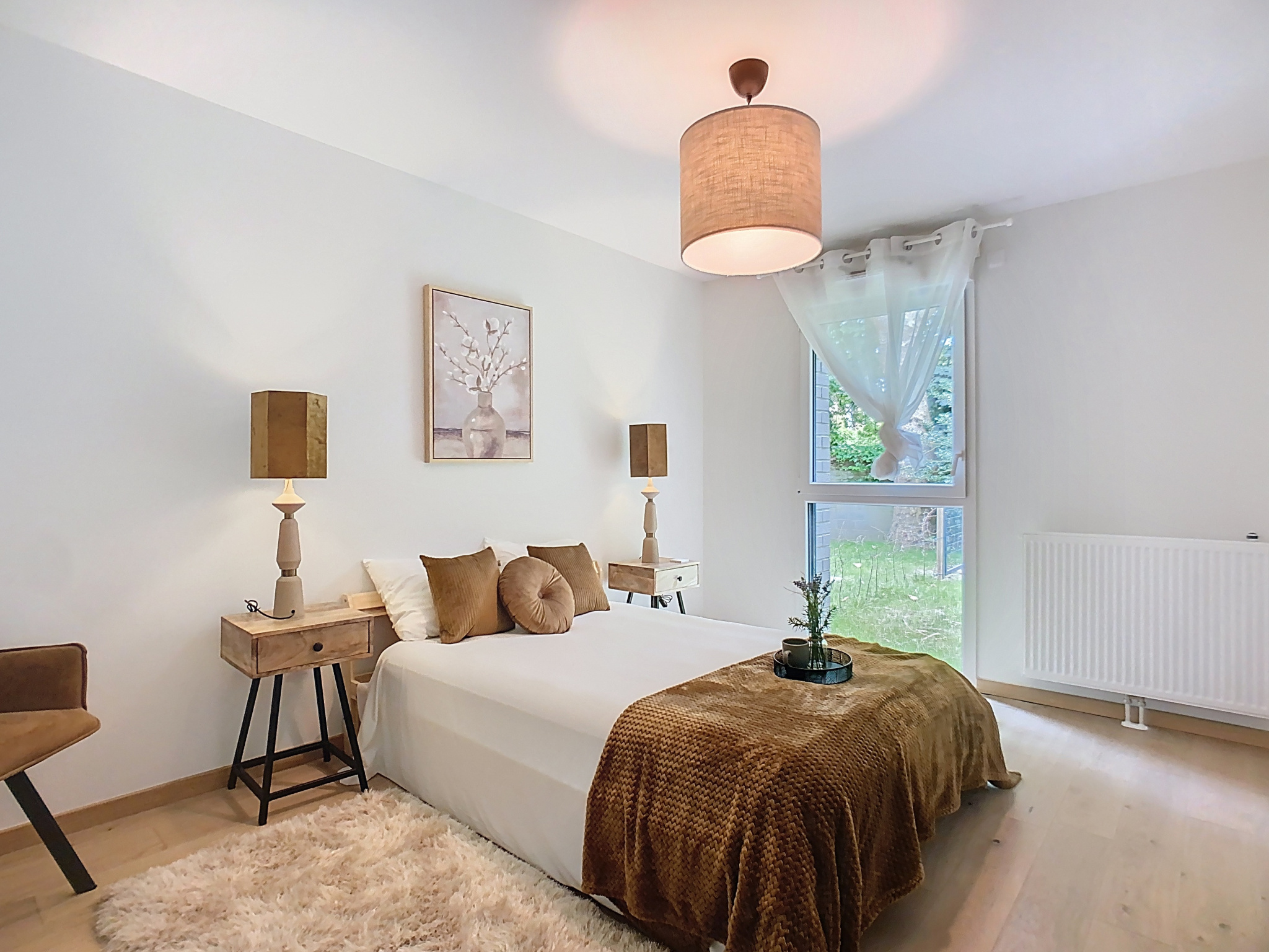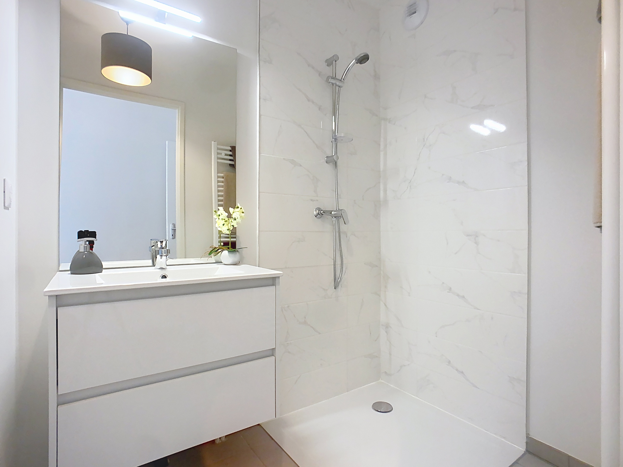 Ce bel appartement en rez-de-jardin se compose d'une entrée, d'un salon/séjour avec sa cuisine ouverte de 34m2, une salle de bain, une salle de douche, 3 confortables chambres et un cellier.