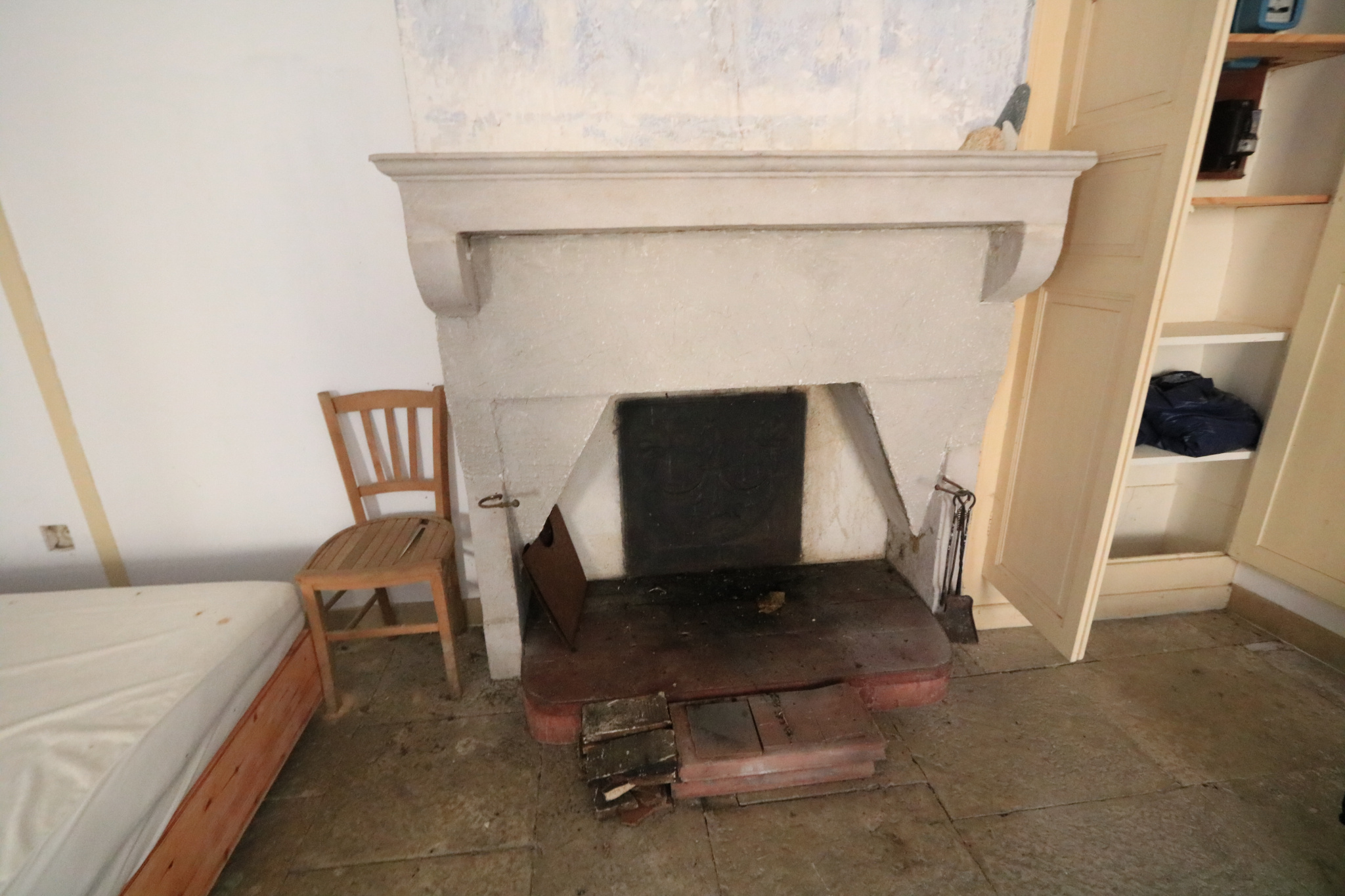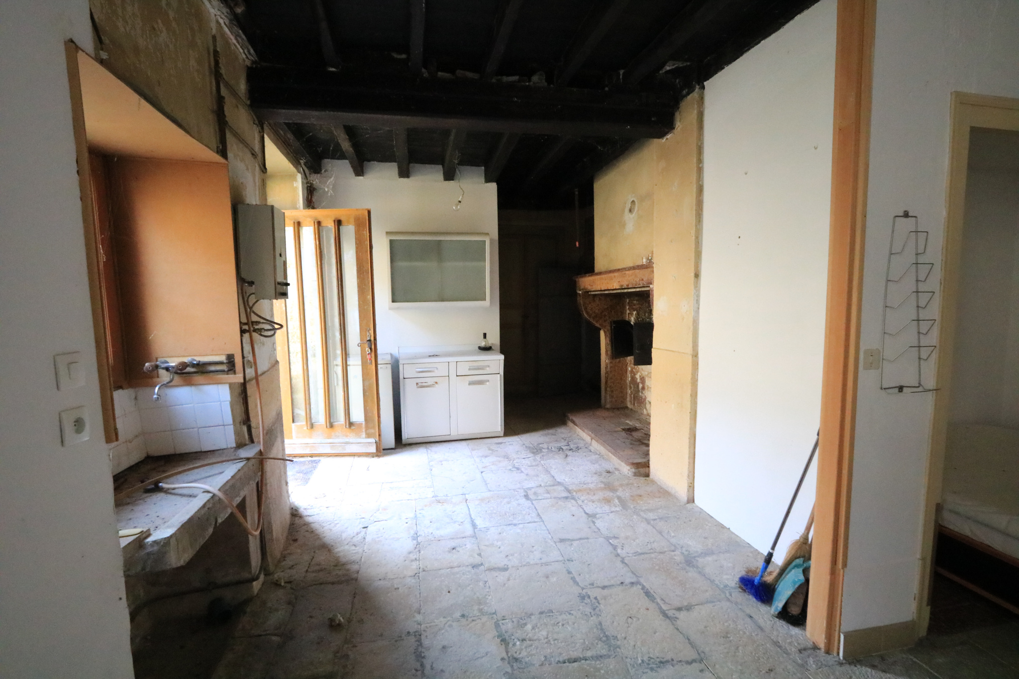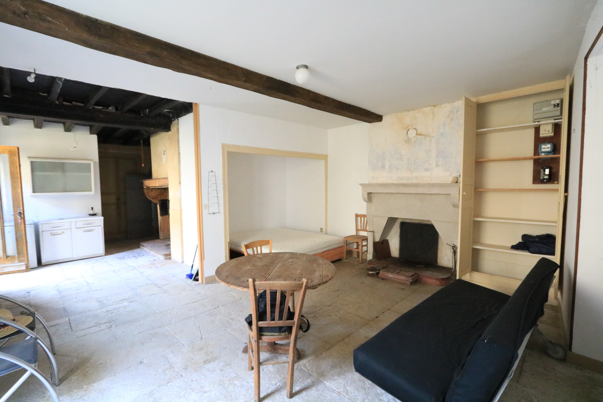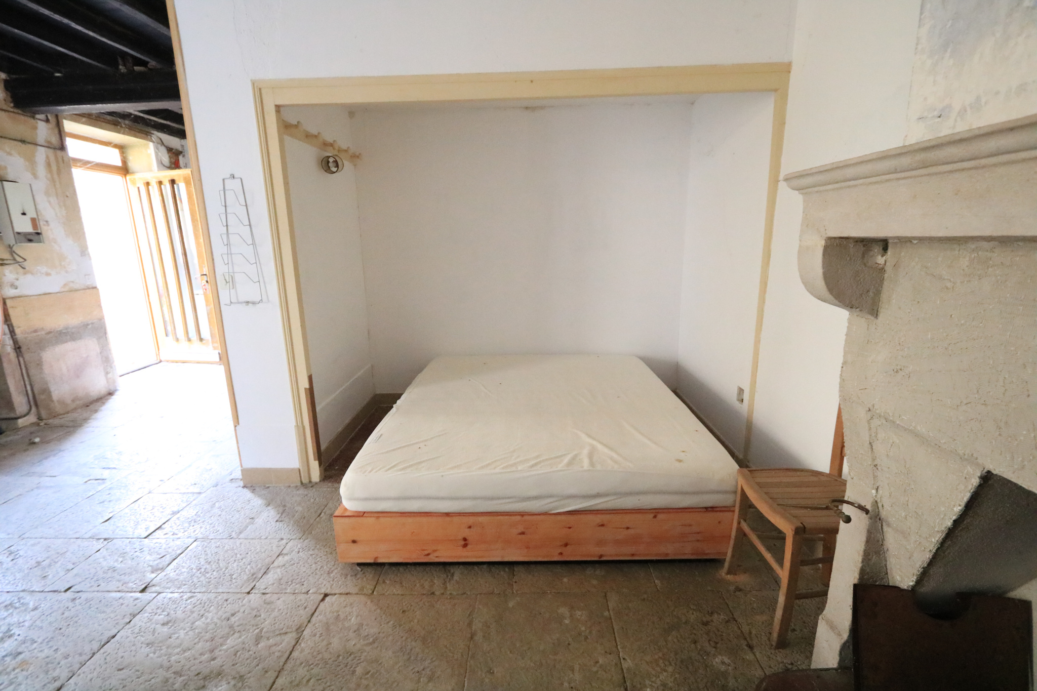Maison en cours de rénovation comprenant au RDC : grande pièce de vie coin cuisine avec four à pain et cheminée, chambre en alcove, salle d'eau / WC.