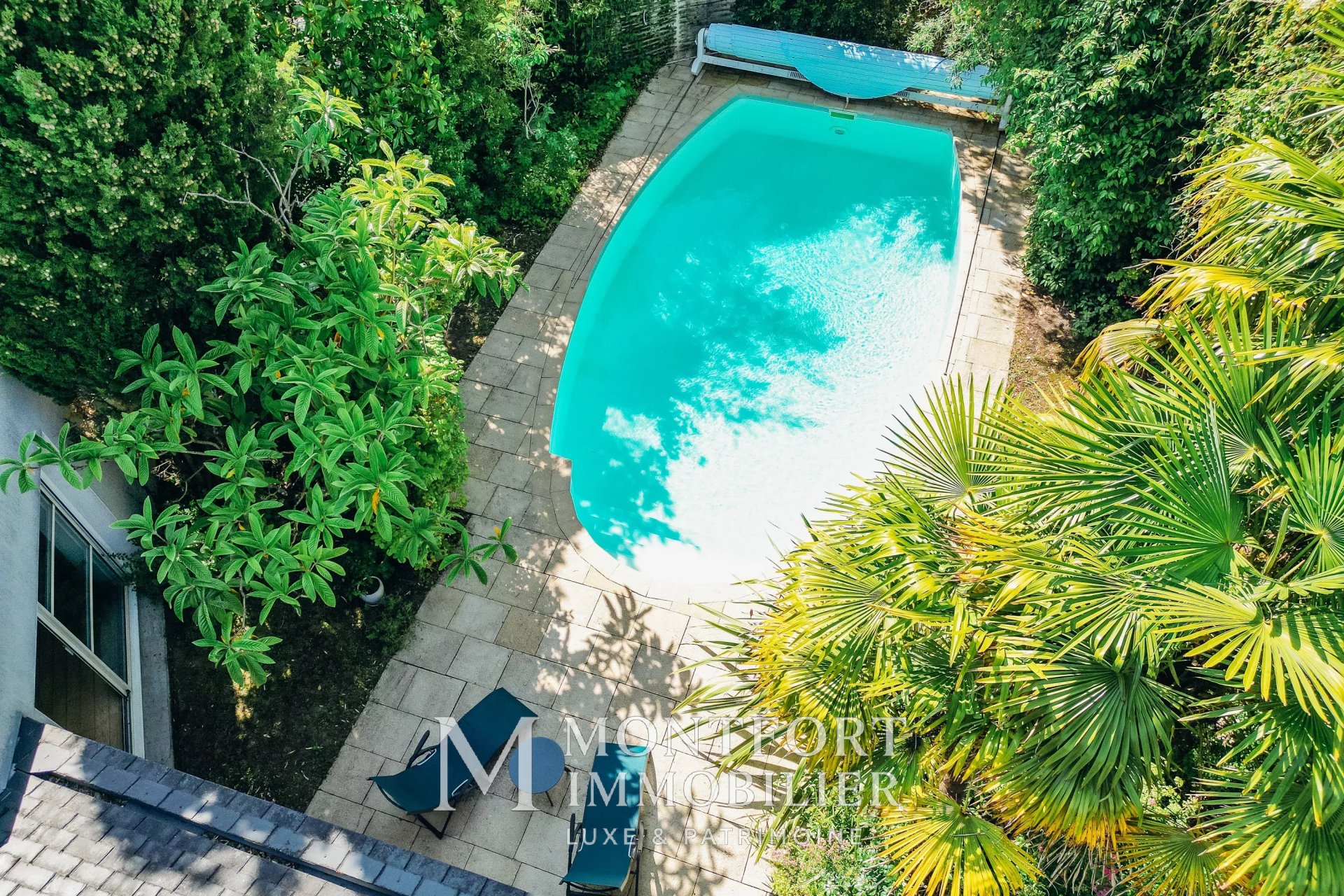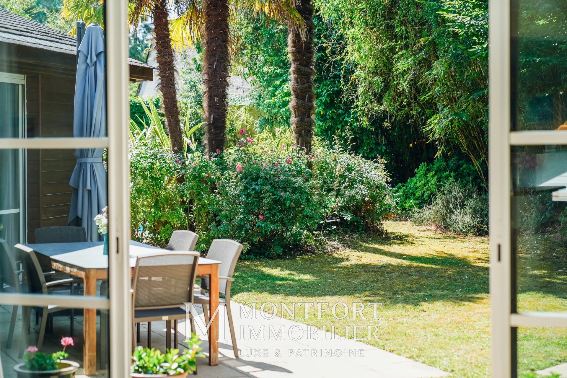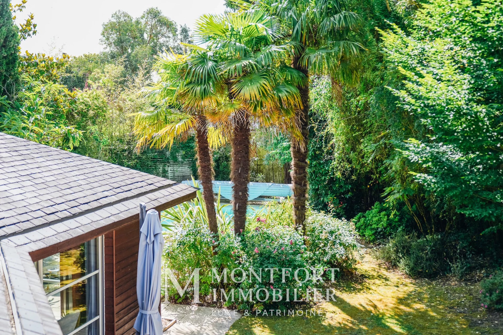 Dès l’entrée, cette maison d’architecte de 1998 séduit par ses volumes et sa luminosité. L’espace de vie principal, de plus de 100 m², bénéficie en grande partie d’un plafond cathédrale et de larges baies vitrées ouvrant sur le jardin.