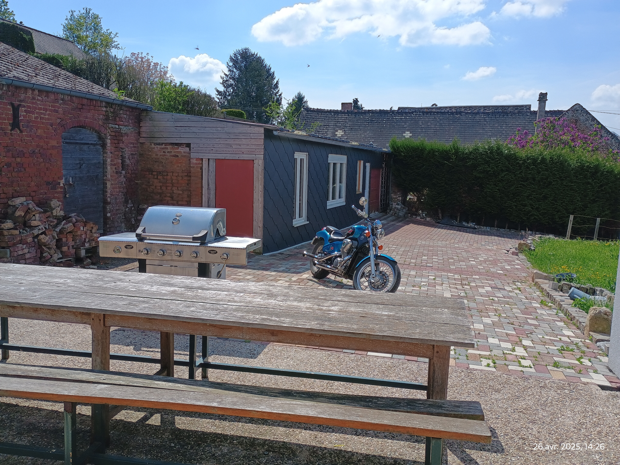 A l'extérieur, un terrain de plus de 1000 m2, une belle terrasse pavée, diverses dépendances (petit garage, atelier...)