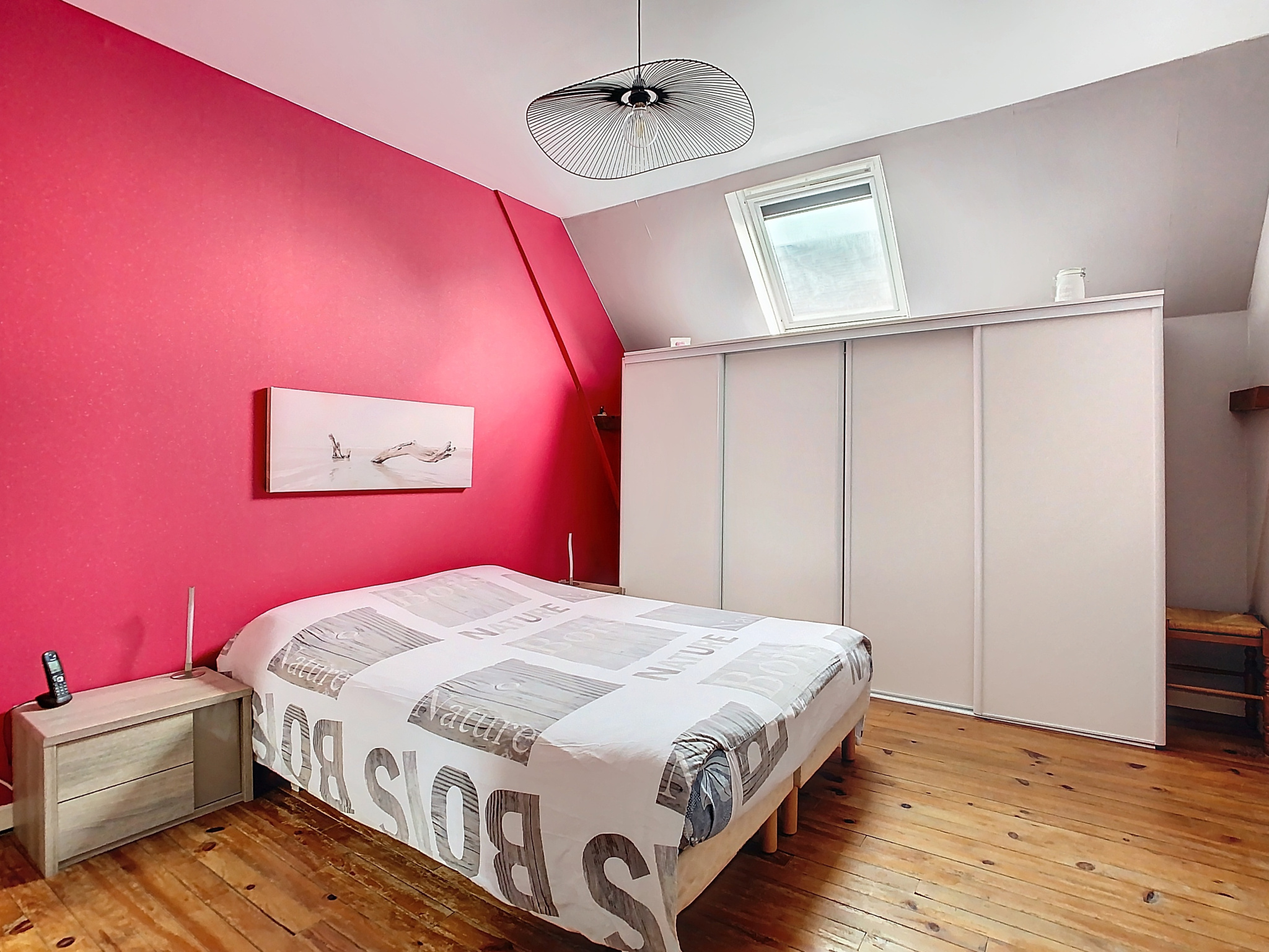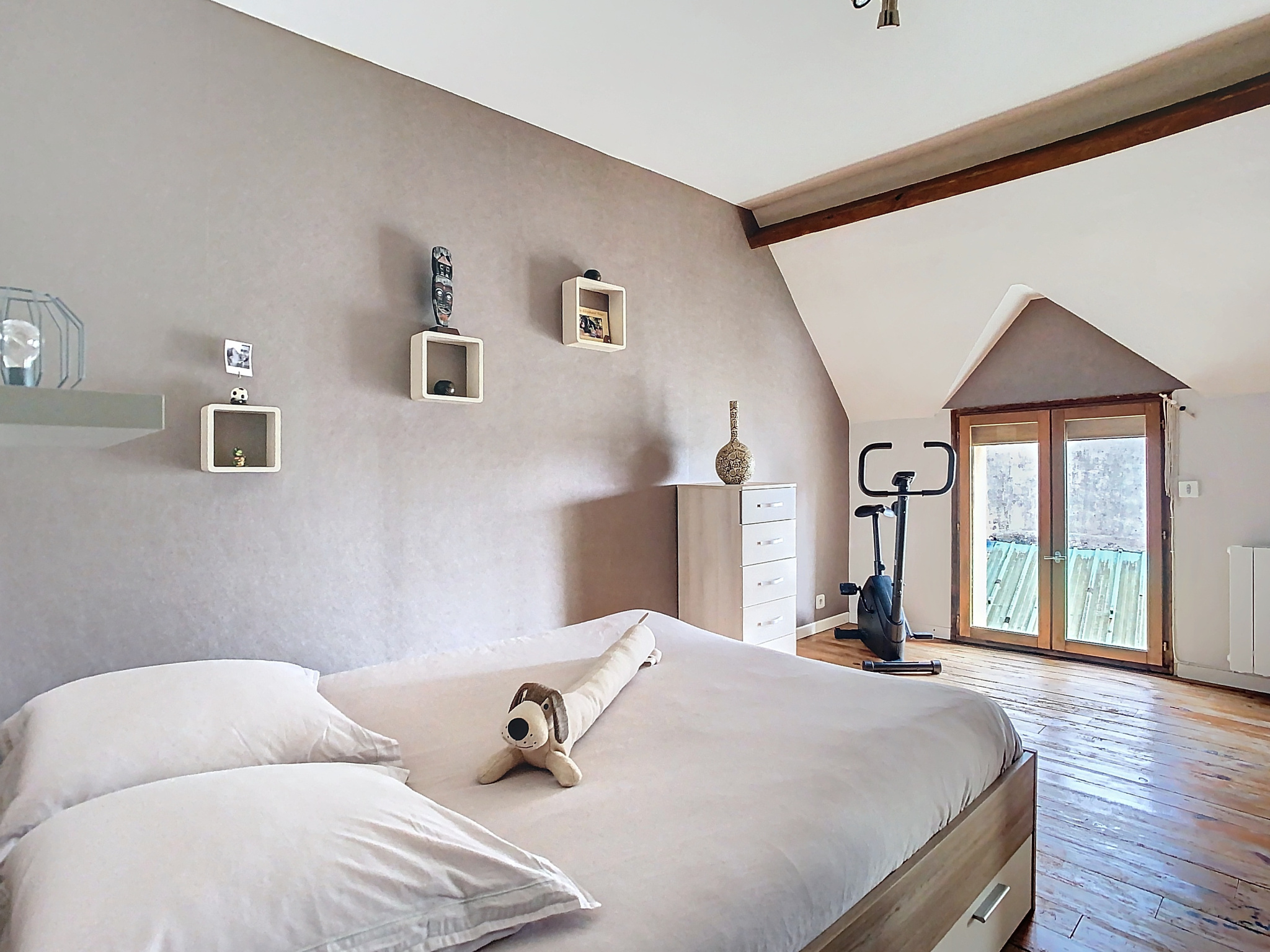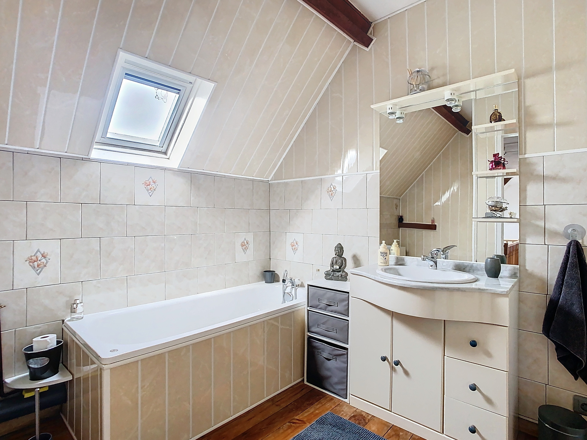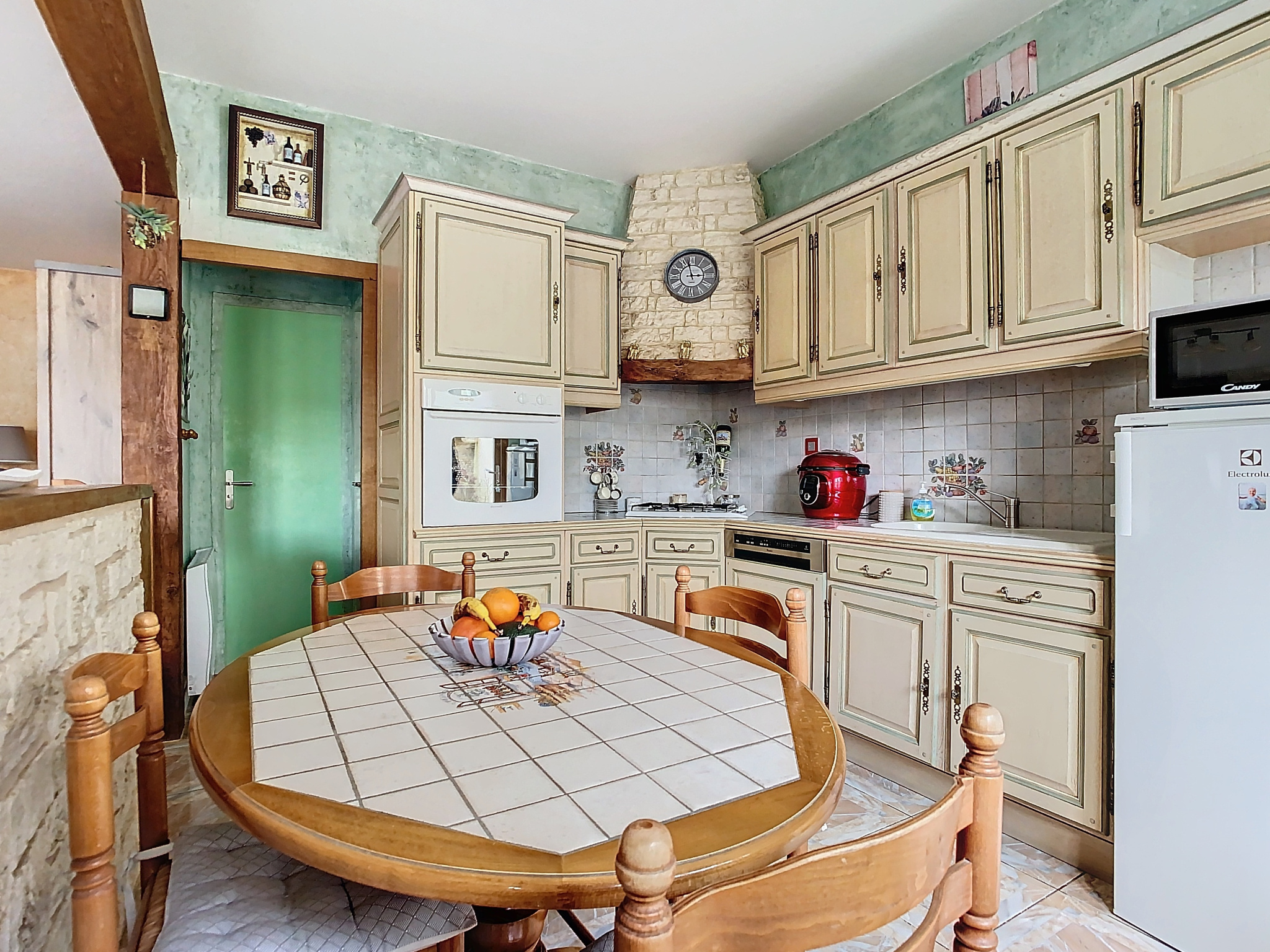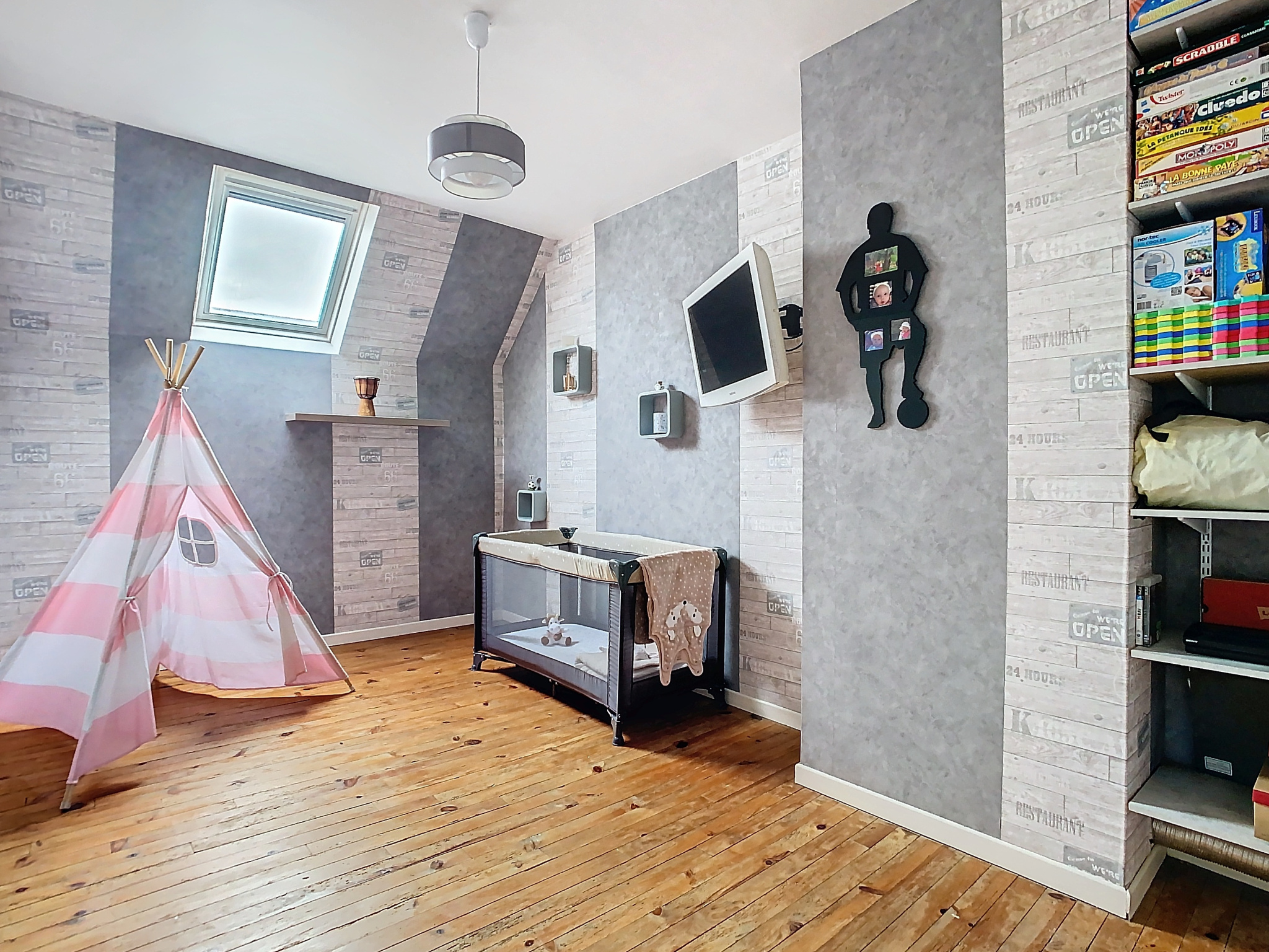 Première partie offrant une maison composée au rdc d'une cuisine équipée ouverte sur un beau séjour / salon avec cheminée, salle d'eau et wc. Etage : palier desservant 3 chambres, salle de bain / wc.