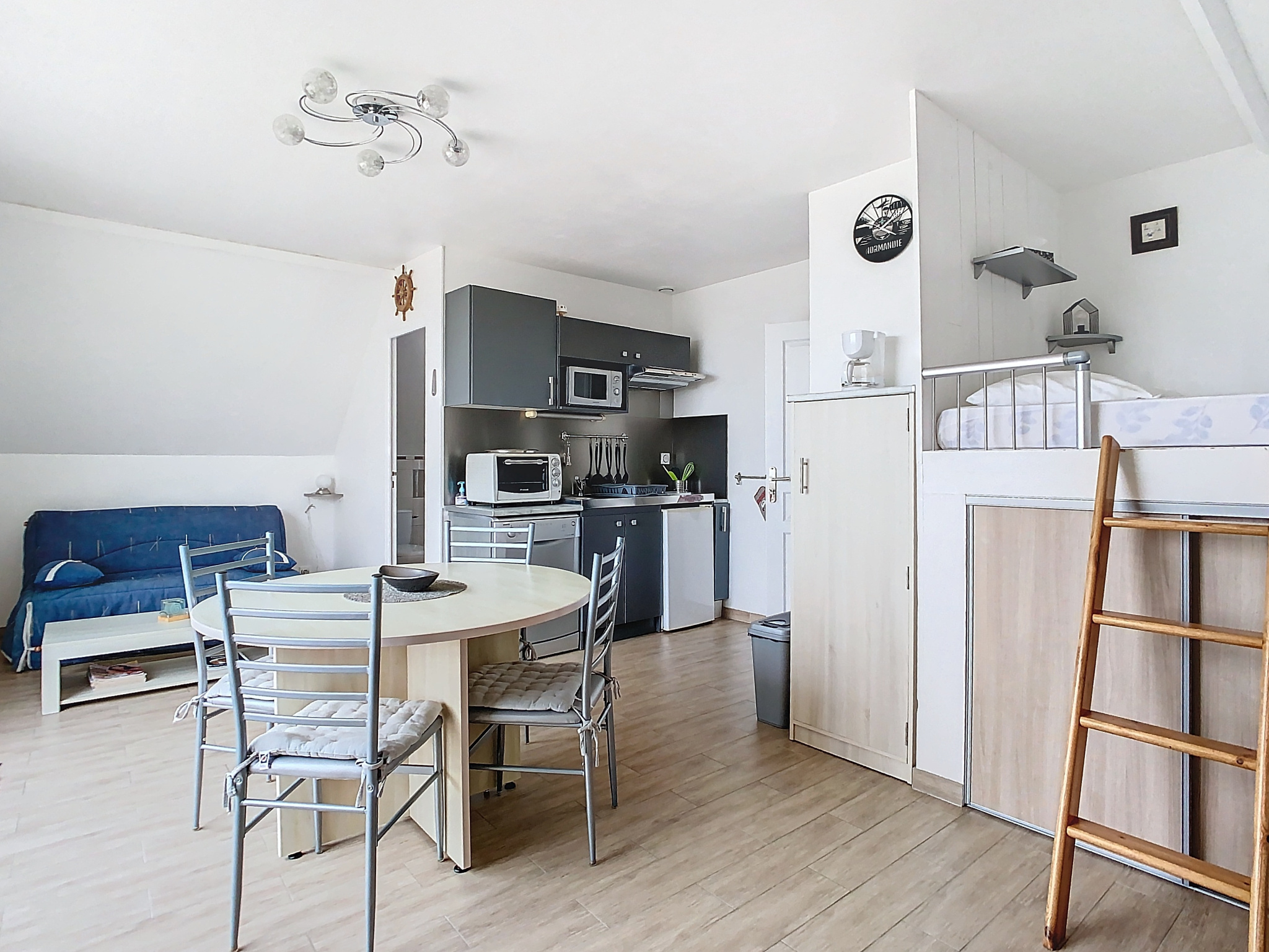 Seconde partie offrant un studio avec une entrée indépendante, pièce de vie avec kitchenette, espace nuit, salle d'eau / wc et balcon avec vue mer !