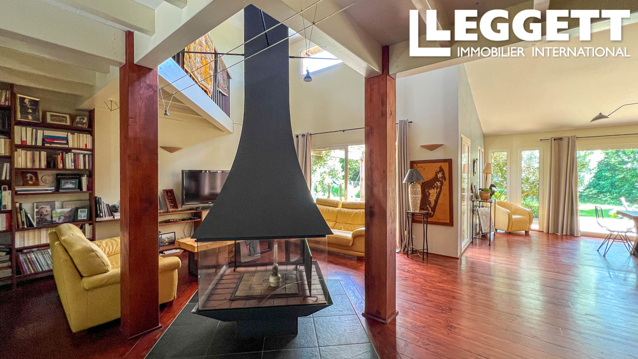 Le coeur de la maison, une pièce de vie cathédrale de 85 m² avec cheminée suspendue, cuisine américaine et mezzanine, s'ouvre sur de grandes terrasses en bois et une superbe piscine chauffée au sel (15 x 4,5 m).